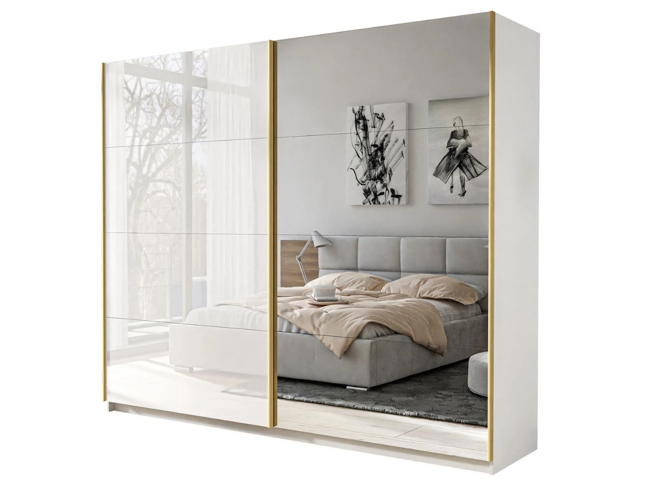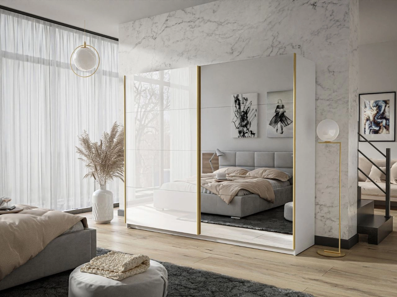 Jedno skrzydło szafy pokryto lustrem, co optycznie powiększa przestrzeń i nadaje wnętrzu głębi, a drugie wykończono w białym wysokim połysku, tworząc efektowny kontrast i podkreślając nowoczesny charakter mebla. Złote akcenty wzdłuż krawędzi dodają elegancji, a stabilne prowadnice gwarantują płynne przesuwanie drzwi.