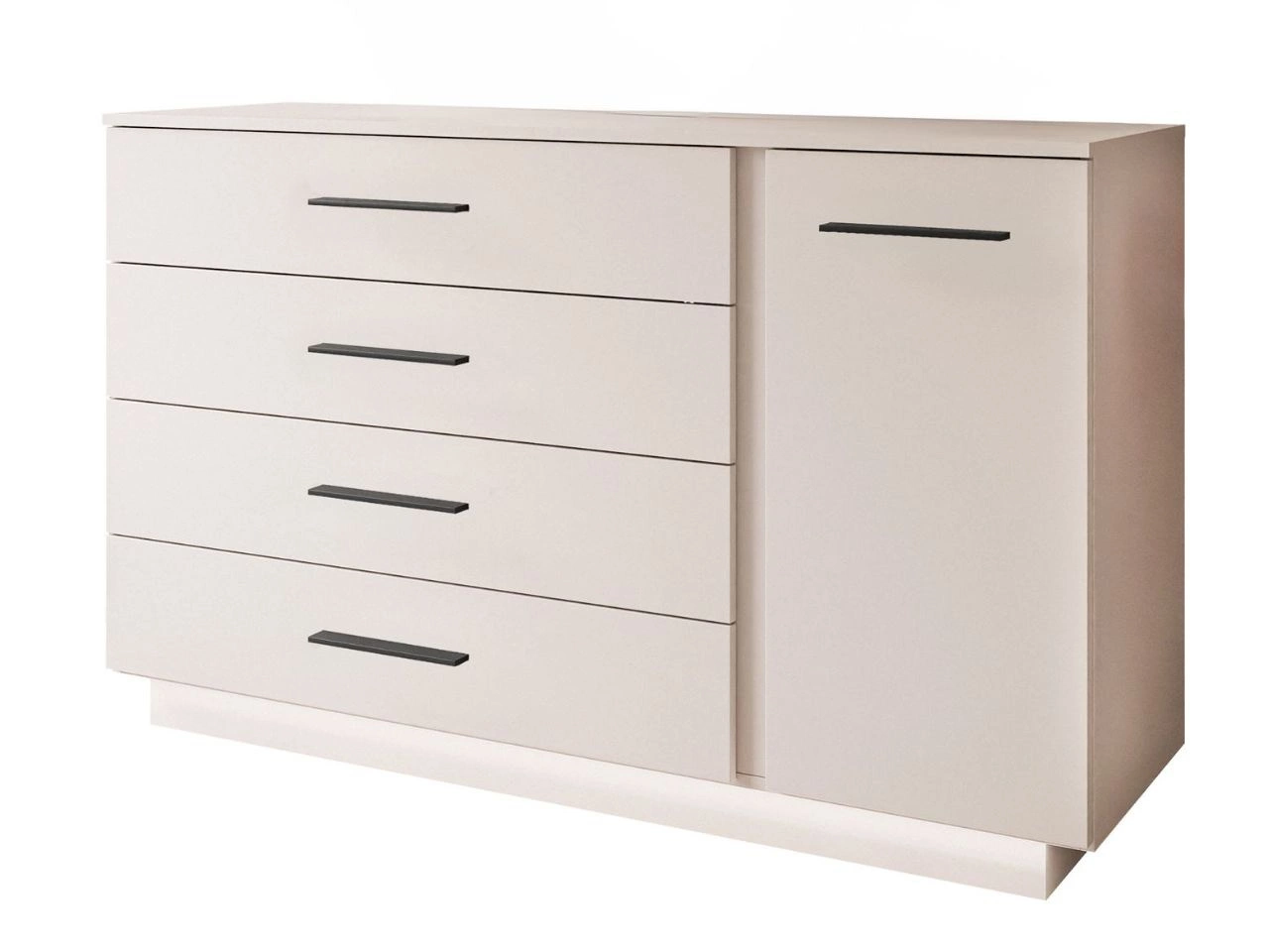 Ten model wyróżnia się prostą linią i frontami w macie, które optycznie powiększają przestrzeń i dodają wnętrzu lekkości. Dzięki uniwersalnemu designowi komoda Nuveo sprawdzi się w salonie, sypialni, pokoju młodzieżowym czy przedpokoju.