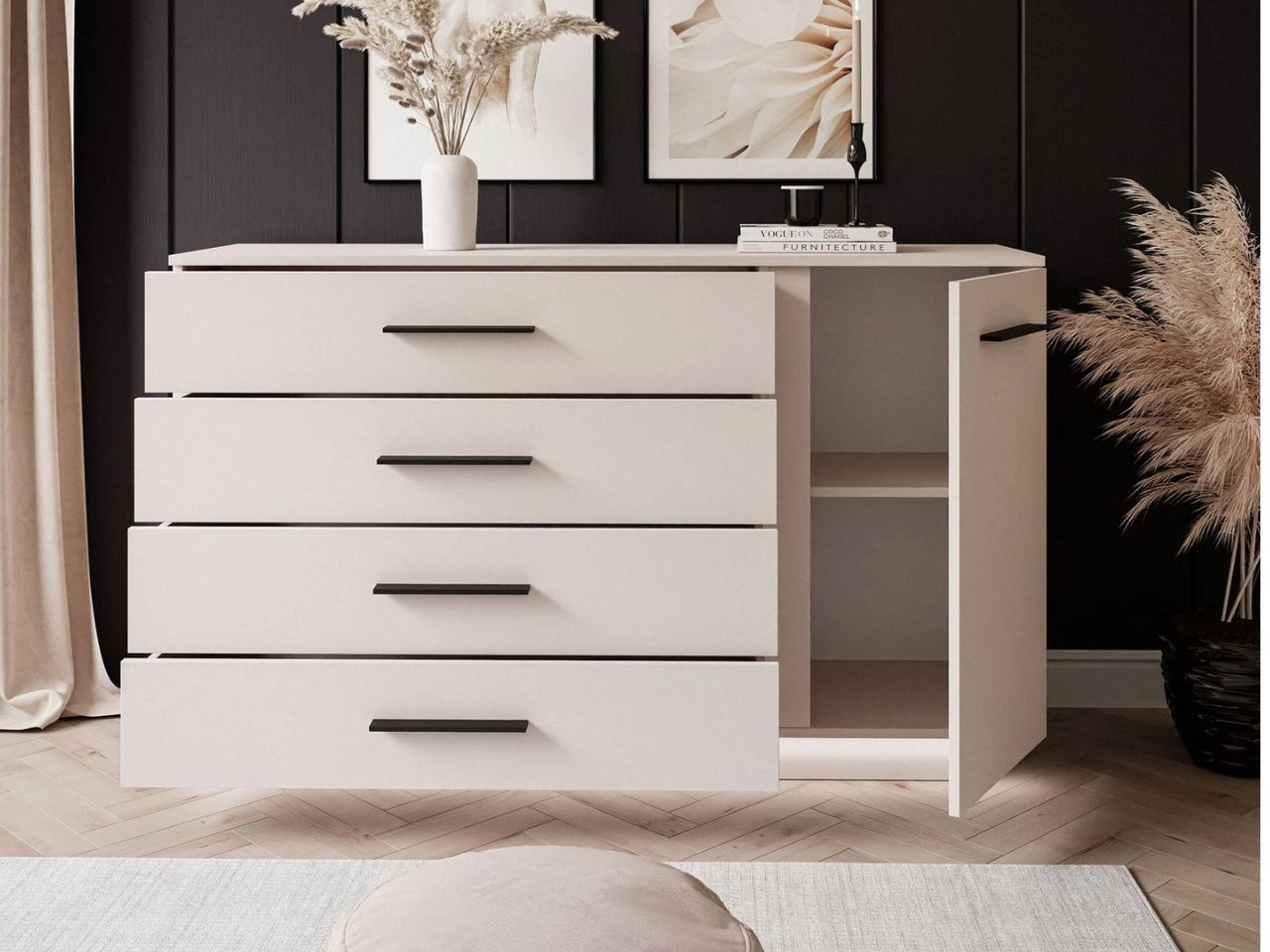 Szeroka komoda posiada cztery pojemne szuflady oraz pionową szafkę z półką, co umożliwia wygodne przechowywanie ubrań, dokumentów, dodatków czy drobiazgów. Szeroki blat stanowi dodatkową przestrzeń ekspozycyjną na dekoracje, rodzinne zdjęcia i pamiątki.