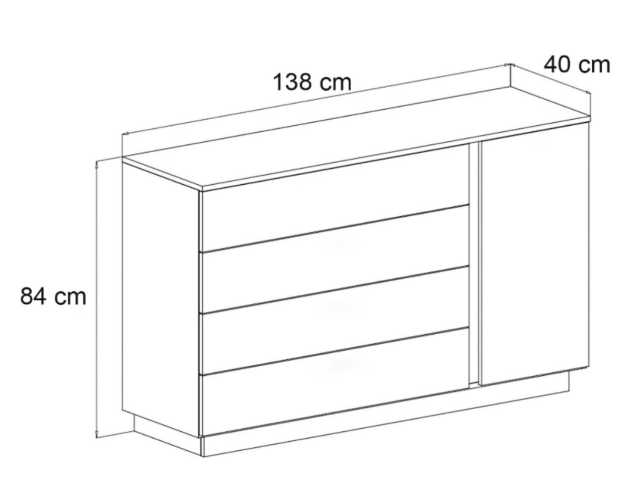 Szeroka komoda posiada cztery pojemne szuflady oraz pionową szafkę z półką, co umożliwia wygodne przechowywanie ubrań, dokumentów, dodatków czy drobiazgów. Szeroki blat stanowi dodatkową przestrzeń ekspozycyjną na dekoracje, rodzinne zdjęcia i pamiątki.