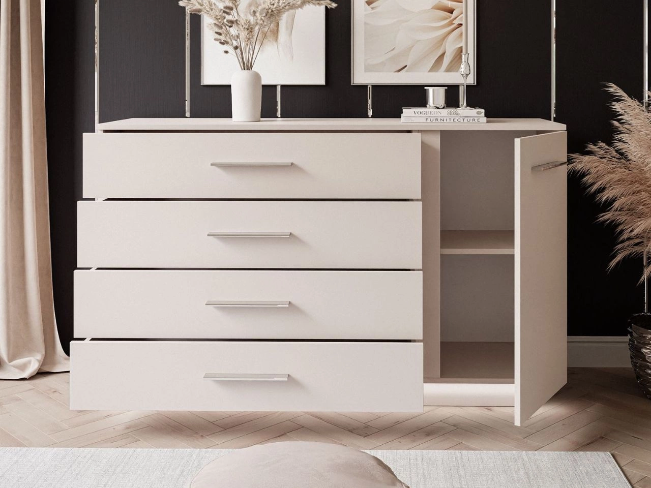 Szeroka komoda posiada cztery pojemne szuflady oraz pionową szafkę z półką, co umożliwia wygodne przechowywanie ubrań, dokumentów, dodatków czy drobiazgów. Szeroki blat stanowi dodatkową przestrzeń ekspozycyjną na dekoracje, rodzinne zdjęcia i pamiątki.