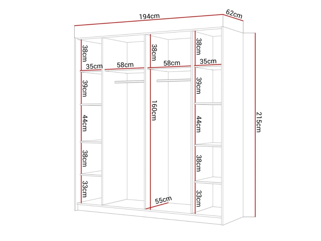 Wnętrze szafy podzielono na dwie symetryczne części, z pojemnymi półkami i drążkiem na wieszaki, co umożliwia wygodne przechowywanie ubrań, dodatków i akcesoriów. Tak przemyślany układ pozwala zachować porządek i łatwość dostępu do wszystkich elementów garderoby.