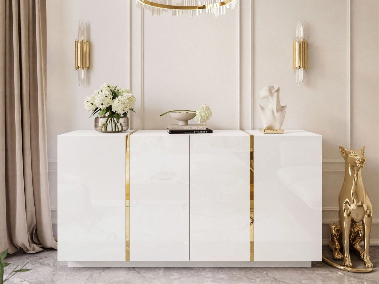 Czterodrzwiowa komoda 158 cm w stylu glamour Lunelie biały połysk