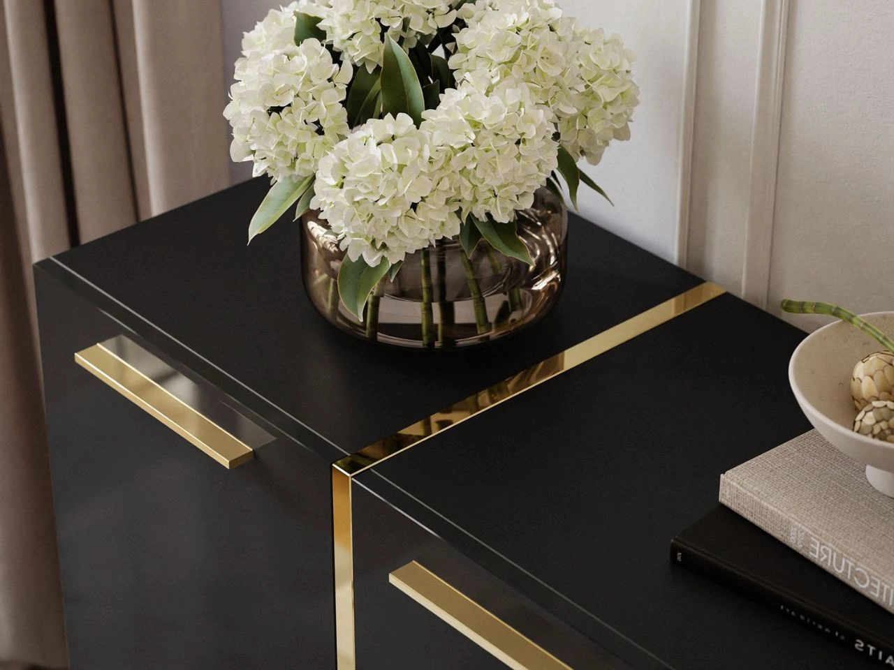 Szeroka czarna komoda Lunelie sprawdzi się nie tylko jako miejsce do przechowywania przedmiotów, ale dzięki swojemu przestronnemu blatowi znajdzie również zastosowanie jako komoda RTV, na której ustawimy nawet bardzo duży telewizor. Mebel wykonany został z wysokiej klasy płyty laminowanej. Fronty wykończono na wysoki czarny połysk, korpus natomiast ma odcień czarnego matu. Elegancki design podkreślają dodatkowo dwie złote listwy umiejscowione pionowo między drzwiczkami. Drzwiczki posiadają również stylowe uchwyty w złotym kolorze.