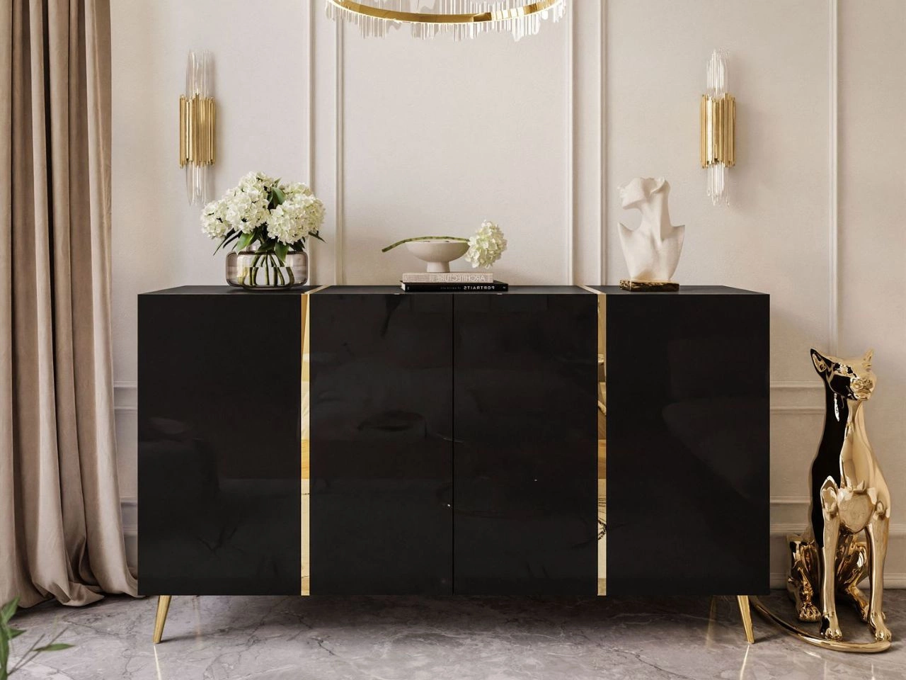 Czterodrzwiowa komoda 158 cm w stylu glamour na złotych nogach Lunelie czarny połysk