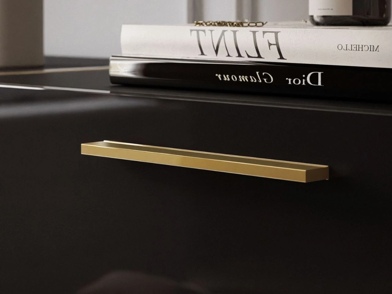 Szeroka czarna komoda Lunelie sprawdzi się nie tylko jako miejsce do przechowywania przedmiotów, ale dzięki swojemu przestronnemu blatowi znajdzie również zastosowanie jako komoda RTV, na której ustawimy nawet bardzo duży telewizor. Mebel wykonany został z wysokiej klasy płyty laminowanej. Fronty wykończono na wysoki czarny połysk, korpus natomiast ma odcień czarnego matu. Elegancki design podkreślają dodatkowo dwie złote listwy umiejscowione pionowo między drzwiczkami. Drzwiczki posiadają również stylowe uchwyty w złotym kolorze.