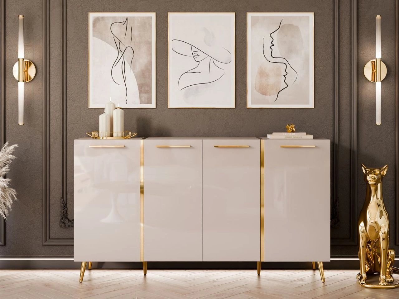 Czterodrzwiowa komoda 158 cm w stylu glamour ze złotymi uchwytami i nogami Lunelie kaszmir połysk