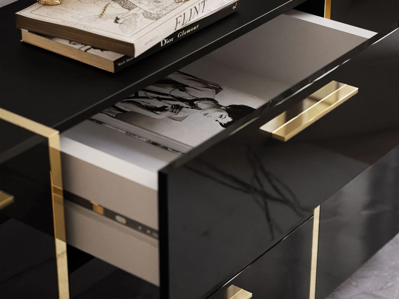 Czarna, dwudrzwiowa komoda z trzema szufladami Lunelie już na pierwszy rzut oka przykuwa uwagę złotymi detalami w postaci eleganckich uchwytów i złotych listew biegnących przez blat i fronty. To właśnie te elementy decydują o wyjątkowym designie tego mebla. Zarówno korpus, jak i fronty powstały z wysokiej klasy płyty laminowanej. Fronty wykończono na wysoki połysk, korpus pozostawiono natomiast w matowej czerni.