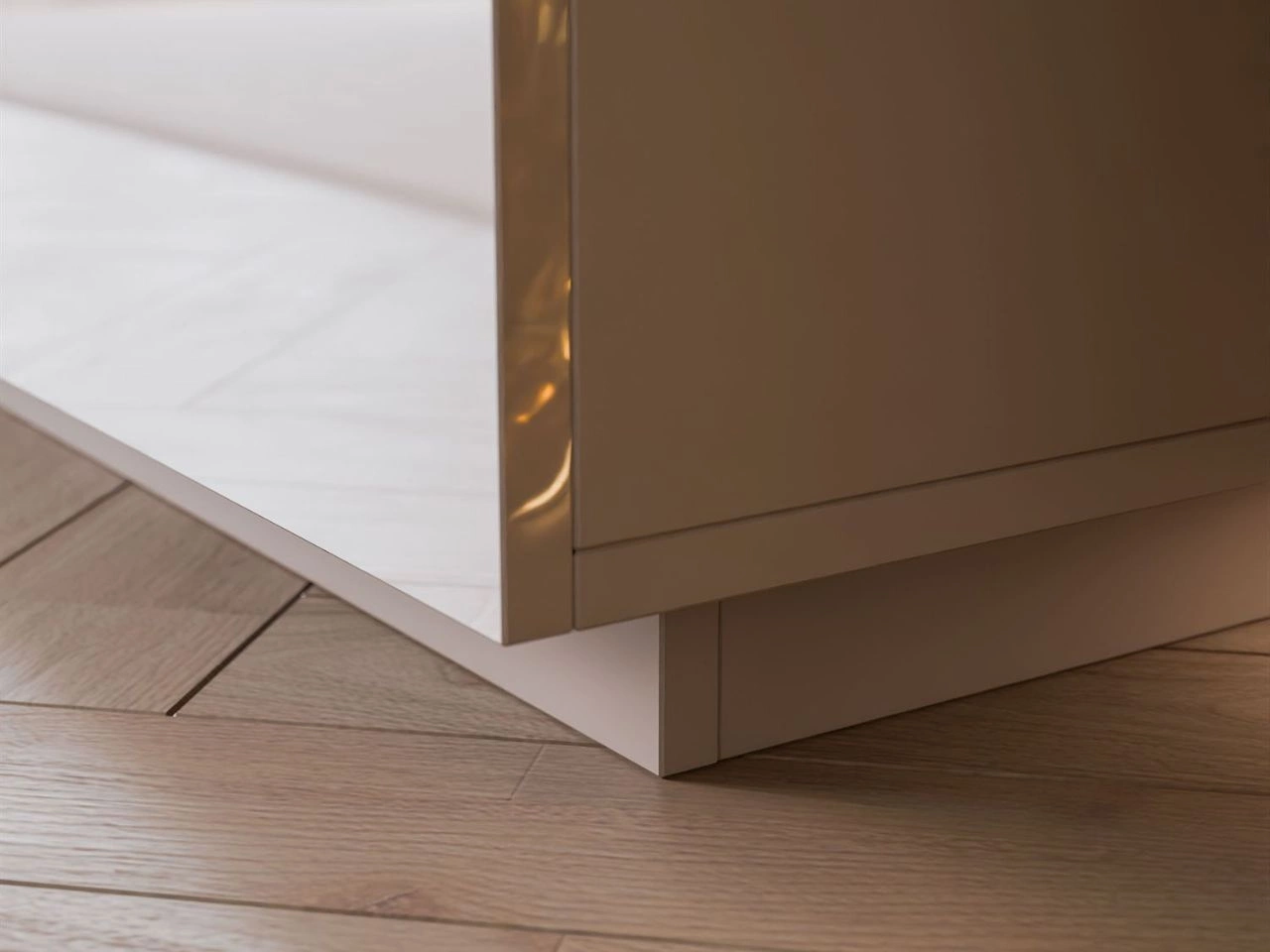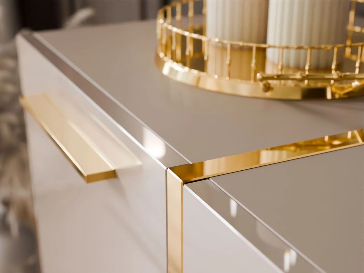 Kaszmirowa, dwudrzwiowa komoda z trzema szufladami Lunelie już na pierwszy rzut oka przykuwa uwagę złotymi detalami w postaci eleganckich uchwytów i złotych listew biegnących przez blat i fronty. To właśnie te elementy decydują o wyjątkowym designie tego mebla. Zarówno korpus, jak i fronty powstały z wysokiej klasy płyty laminowanej. Fronty wykończono na wysoki połysk, korpus pozostawiono natomiast w matowym kaszmirze.