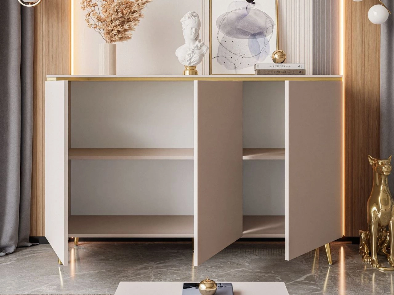 Trzydrzwiowa komoda glamour na złotych nogach Evare Kaszmir