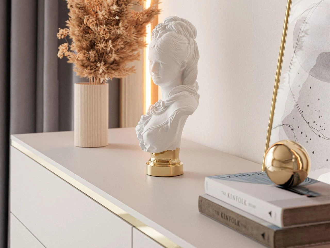 Trzydrzwiowa komoda zapewnia dużo przestrzeni do przechowywania. Wnętrze komody wyposażono w praktyczne półki, idealne na odzież, dokumenty, zastawę stołową czy domowe dodatki. Gładkie fronty otwierane w systemie PUSH TO OPEN gwarantują wygodę użytkowania i podkreślają minimalistyczny charakter mebla. Dzięki wysokości 90 cm blat komody staje się dodatkową powierzchnią ekspozycyjną, na której można ustawić kwiaty, lampę czy eleganckie dekoracje.