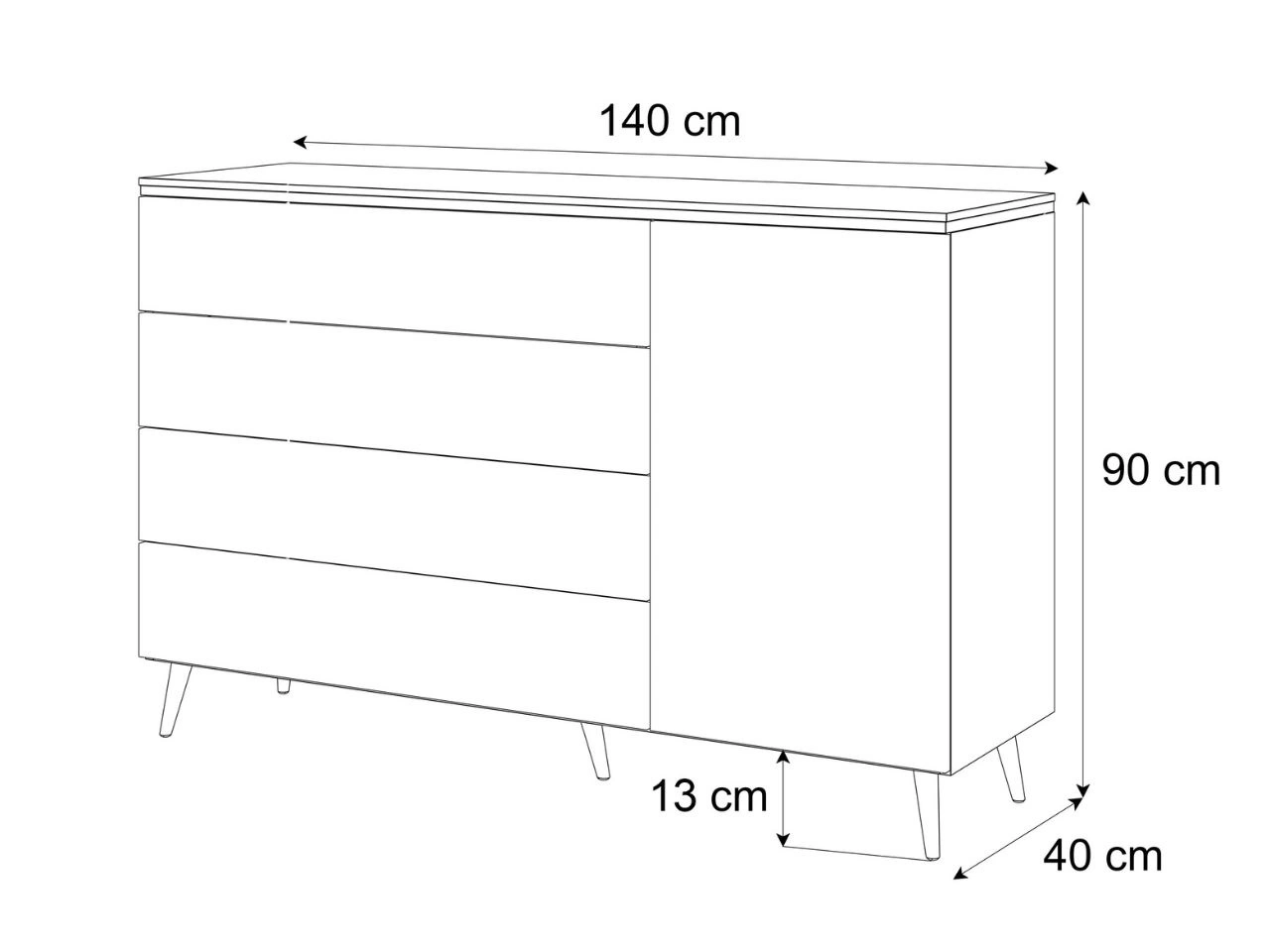 Układ przestronnej komody Evare został zaprojektowany z myślą o maksymalnej funkcjonalności. Cztery pojemne szuflady ułatwiają przechowywanie i segregację drobiazgów, dokumentów czy akcesoriów, a przestrzeń za drzwiami świetnie sprawdzi się na większe przedmioty. Dzięki temu każdy element znajdzie swoje miejsce, a porządek w pomieszczeniu będzie łatwy do utrzymania. Fronty otwierane w systemie PUSH TO OPEN zapewniają wygodny dostęp do wnętrza i podkreślają nowoczesny, minimalistyczny charakter mebla.