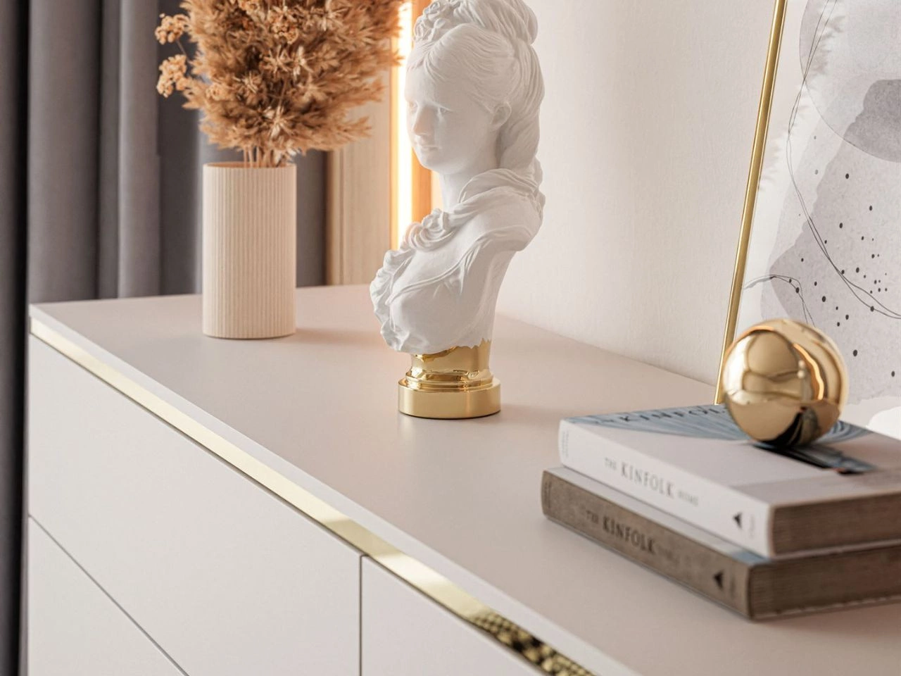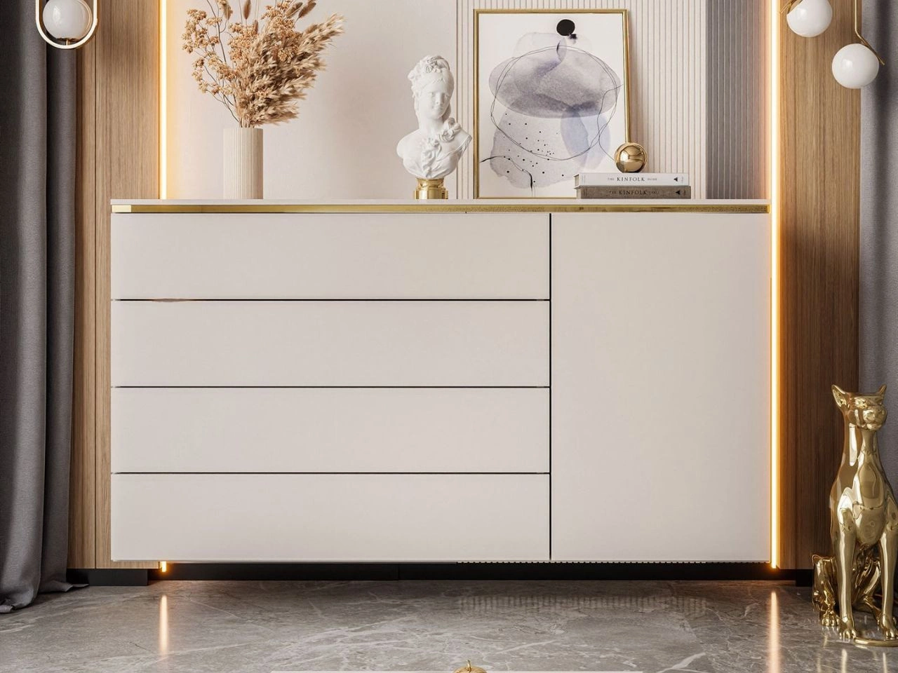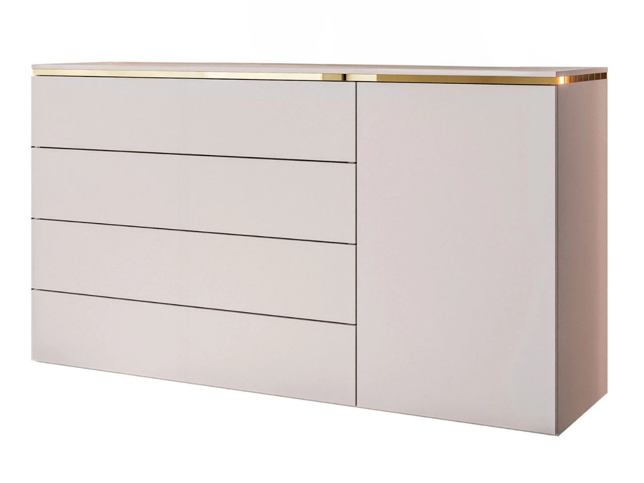 Komoda wisząca Evare z jednymi drzwiami i czterema szufladami to wyjątkowy mebel, który łączy minimalistyczny styl z luksusowym charakterem. Dzięki montażowi na ścianie prezentuje się niezwykle lekko, a jednocześnie pozwala zaoszczędzić przestrzeń i ułatwia utrzymanie czystości w pomieszczeniu. Subtelny złoty pasek na froncie nadaje bryle elegancji, a kaszmirowe wybarwienie sprawia, że komoda pasuje zarówno do nowoczesnych, jak i klasycznych aranżacji.