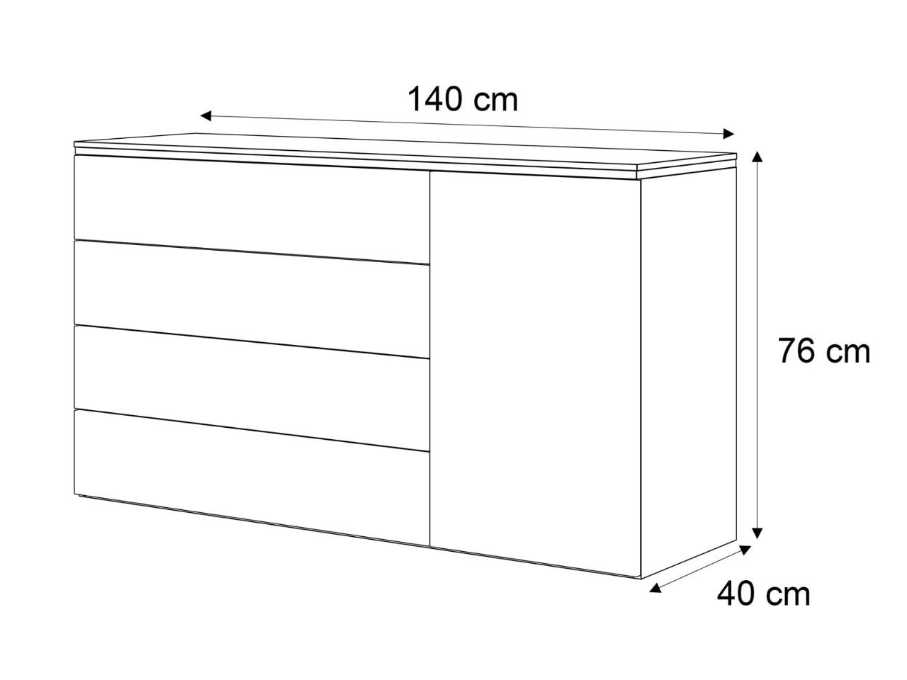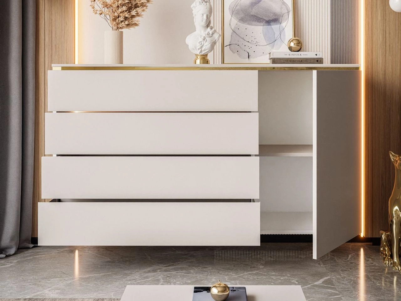 Wnętrze mebla zostało zaprojektowane tak, aby zapewnić maksymalną funkcjonalność. Cztery szuflady pozwalają na wygodne przechowywanie i segregację drobiazgów, dokumentów czy akcesoriów, natomiast przestrzeń za drzwiami świetnie sprawdzi się do schowania większych przedmiotów. Dzięki temu komoda pomaga utrzymać porządek i organizację w domu.