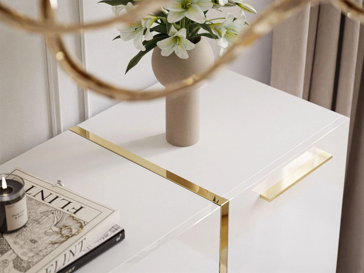 Biała, dwudrzwiowa komoda z trzema szufladami Lunelie już na pierwszy rzut oka przykuwa uwagę złotymi detalami w postaci złotych listew biegnących przez blat i fronty oraz złotych uchwytów i metalowych nóżek. To właśnie te elementy decydują o wyjątkowym designie tego mebla. Zarówno korpus, jak i fronty powstały z wysokiej klasy płyty laminowanej. Fronty wykończono na wysoki połysk, korpus pozostawiono natomiast w matowej bieli.