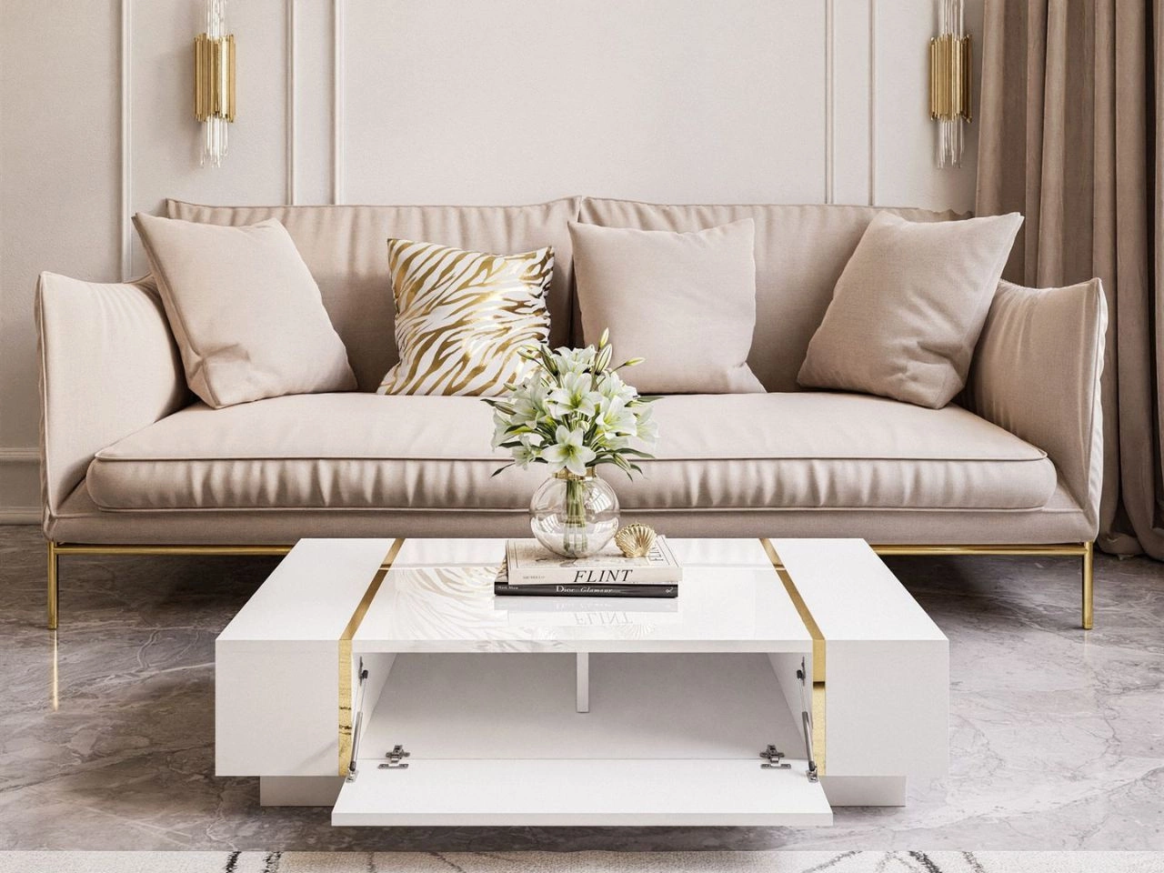 Ława kawowa Lunelie wykonana została z wysokiej klasy płyty laminowanej. Jej fronty wykończono na biały wysoki połysk, korpus natomiast ma odcień matowej bieli. Całość wieńczą ponadto dwie złote listwy, które zdobią blat i fronty. Eleganckiego wizerunku stolika dopełnia minimalistyczny cokół, na którym ustawiono bryłę.