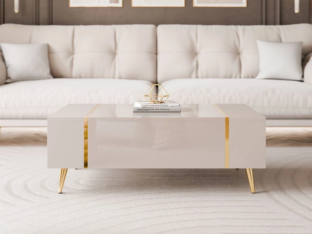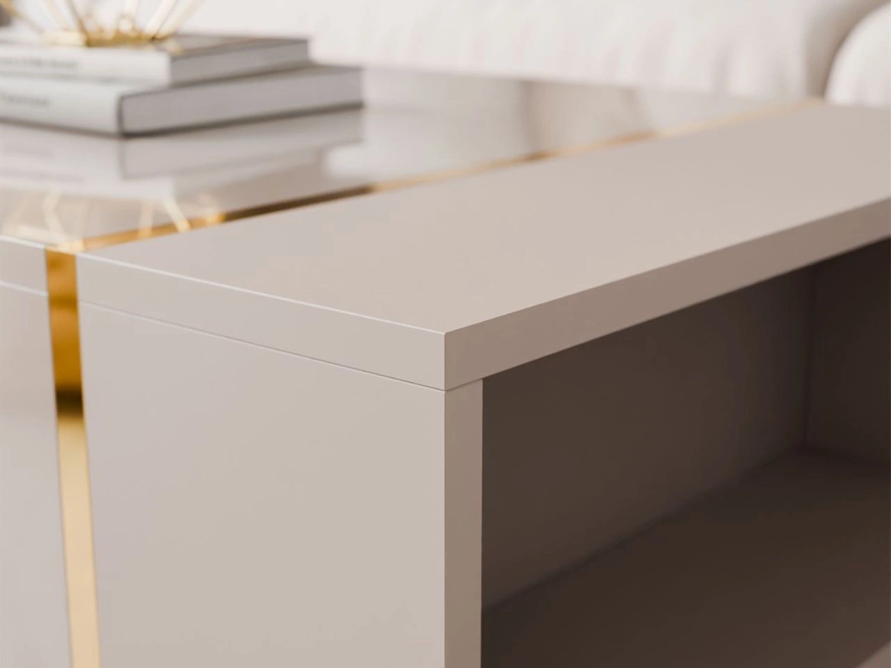 Ława kawowa Lunelie wykonana została z wysokiej klasy płyty laminowanej. Jej fronty wykończono na kaszmirowy wysoki połysk, korpus natomiast ma odcień matowego kaszmiru. Całość wieńczą ponadto dwie złote listwy, które zdobią blat i fronty. Eleganckiego wizerunku stolika dopełniają wykonane z metalu złote nóżki o wysokości 13 cm.