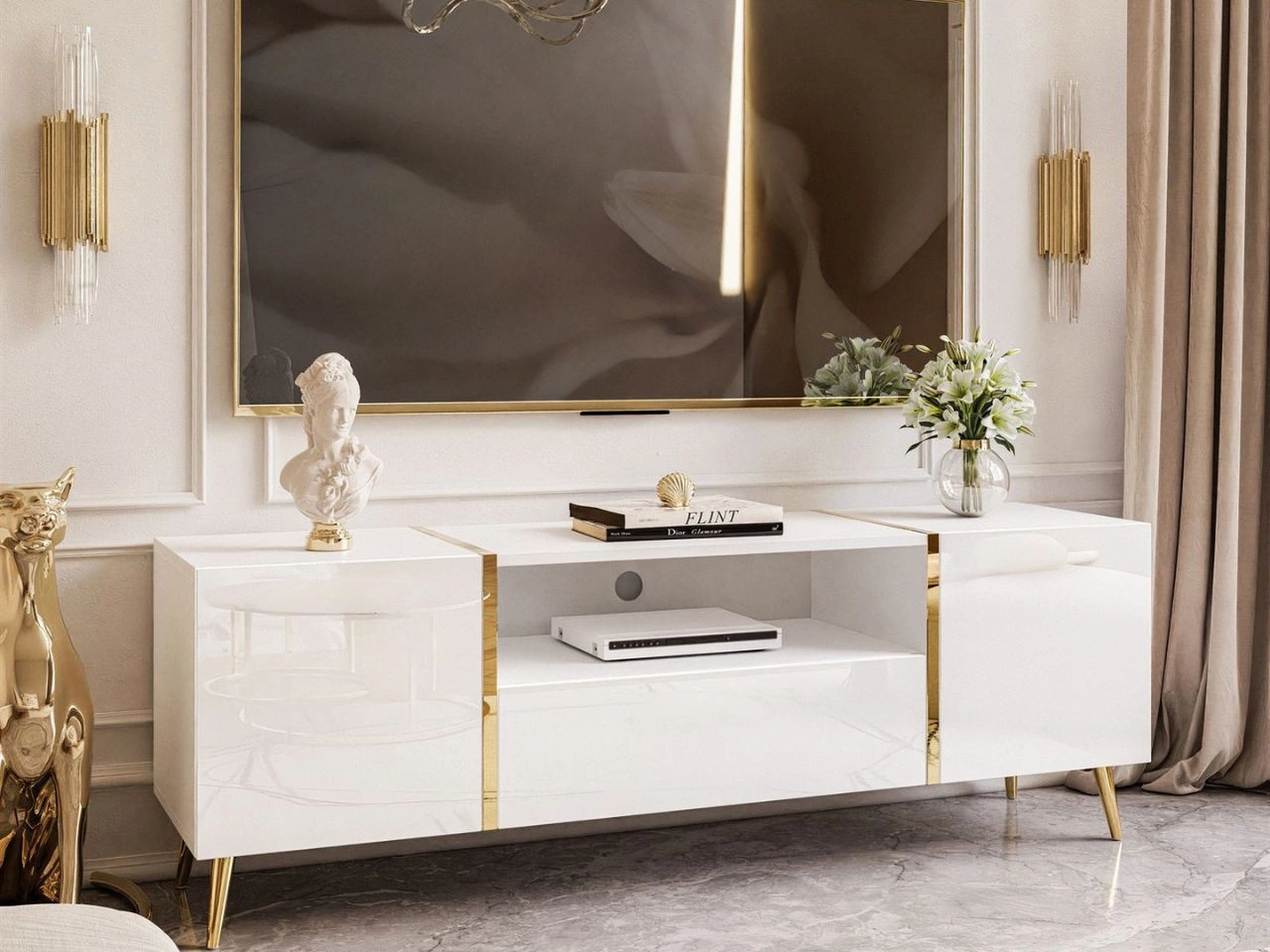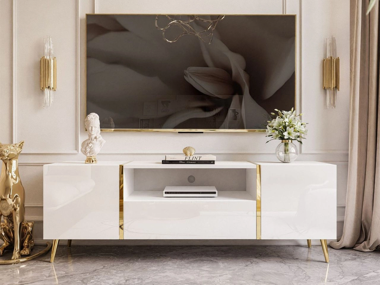 Szafka RTV w stylu glamour z szafkami i szufladą Lunelie biały połysk