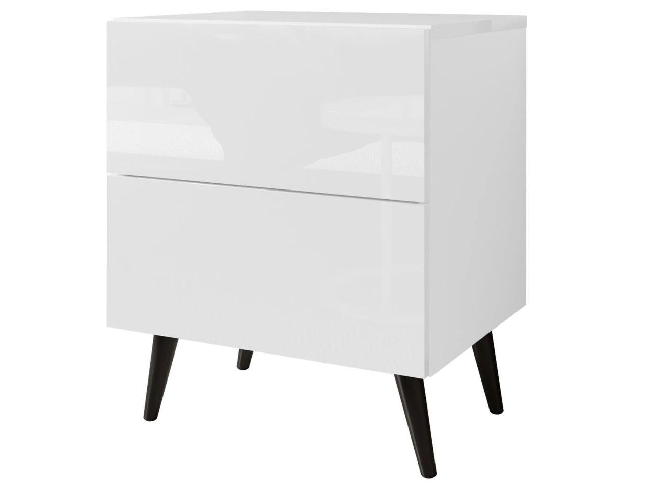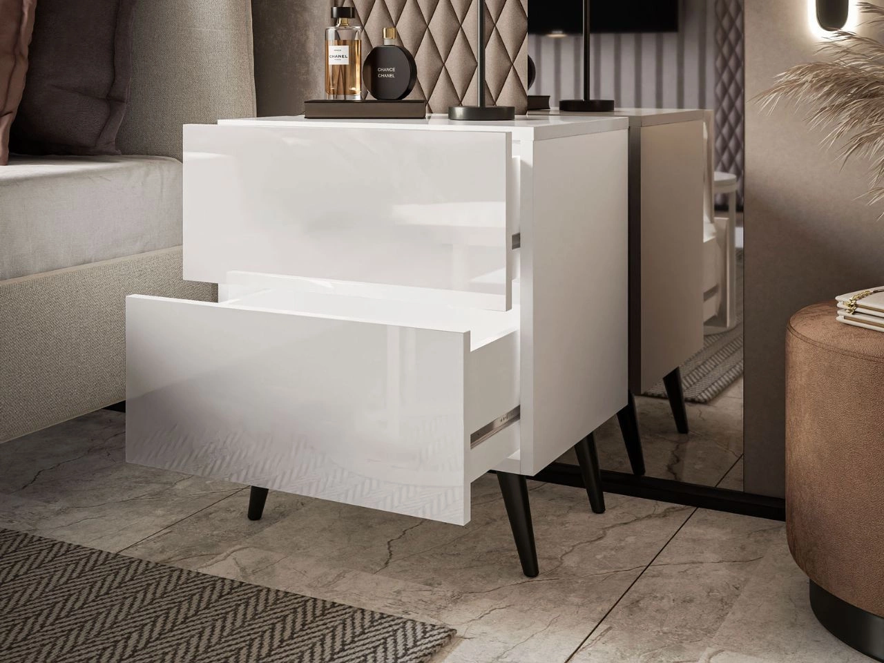 Stolik nocny z szufladami na czarnych nogach Noaé Lux Biały połysk