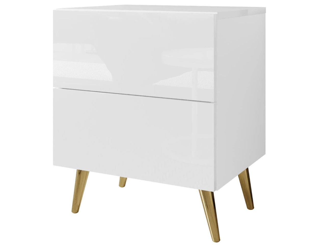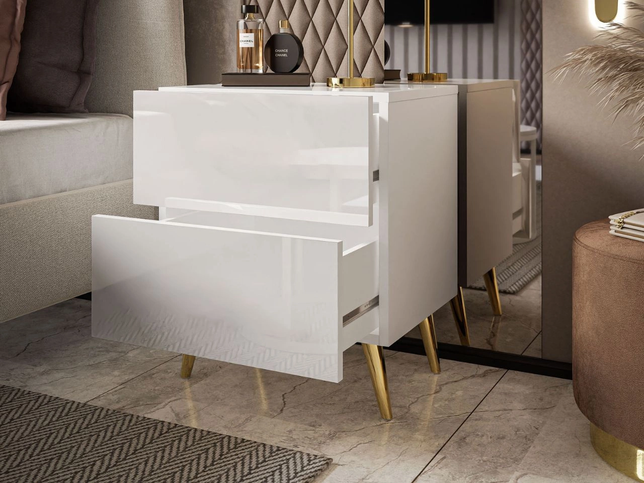 Stolik nocny z szufladami na złotych nogach Noaé Lux Biały połysk