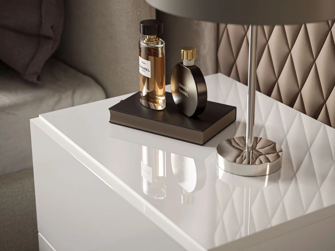 Szafka nocna wyróżnia się wysoką jakością wykonania – korpus powstał z trwałej płyty laminowanej, a fronty i blat w wysokim połysku nie tylko dodają elegancji, ale również optycznie powiększają i rozświetlają wnętrze.
