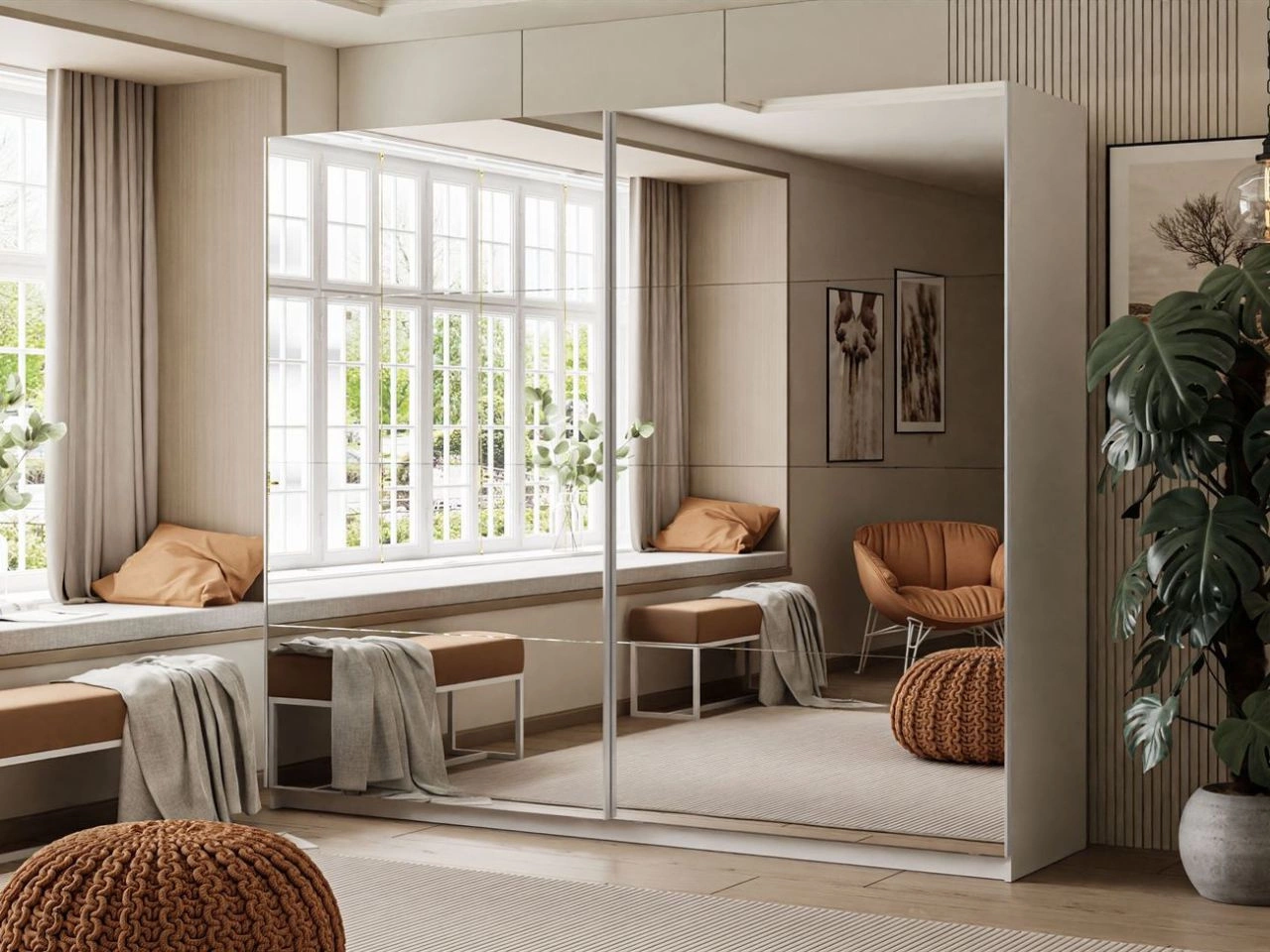 Ta nowoczesna szafa z drzwiami przesuwnymi doskonale wpasuje się zarówno do sypialni, jak i pokoju dziennego. Fronty szafy są całkowicie pokryte lustrem, co optycznie powiększa przestrzeń i nadaje wnętrzu elegancki, nowoczesny charakter. Dzięki solidnym prowadnicom drzwi przesuwają się płynnie i cicho, oszczędzając miejsce i ułatwiając codzienne użytkowanie.