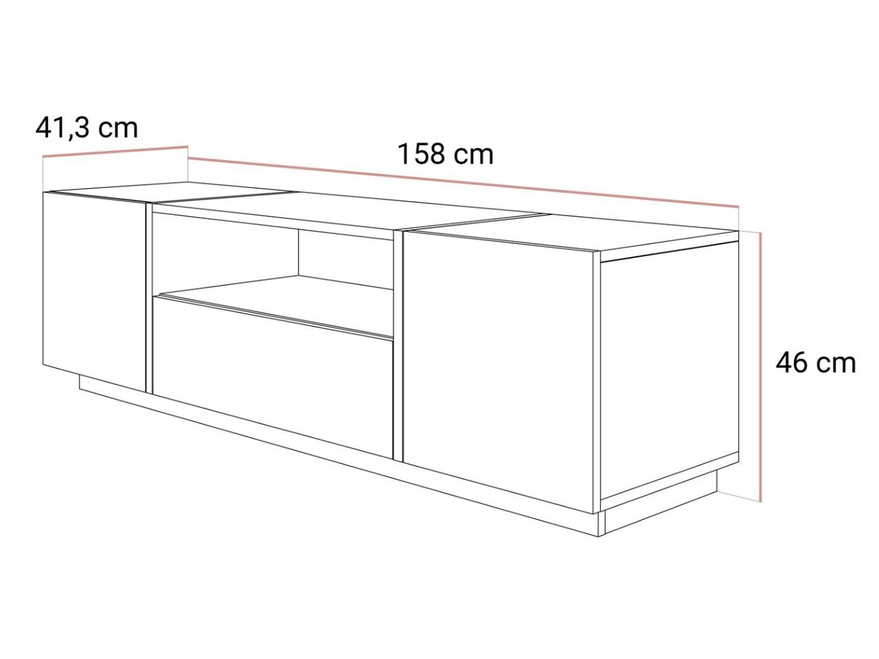 Szafka RTV Lunelie wyposażona jest w dwie szafki i jedną szufladę. Nad szufladą znajduje się wnęka na sprzęt RTV, w której tylnej ściance wycięto okrągły otwór do estetycznego wyprowadzenia przewodów. Szafki posiadają bezuchwytowy system otwierania PUSH TO OPEN – wystarczy nacisnąć krawędź drzwiczek, a te otworzą się samoczynnie. To samo rozwiązanie zastosowano w szufladzie, która dodatkowo posiada prowadnice kulkowe z pełnym wysuwem, zapewniające łatwy dostęp do jej wnętrza.
