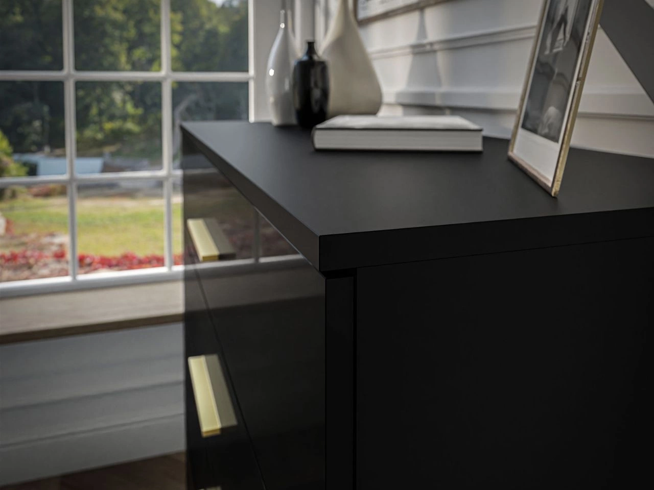 Szukasz praktycznego i stylowego mebla do swojego domu? Czarna komoda Nuveo to idealne rozwiązanie do salonu, sypialni, przedpokoju czy pokoju młodzieżowego. Jej nowoczesna forma i wysoki połysk optycznie powiększają przestrzeń, nadając wnętrzu lekkości i elegancji.