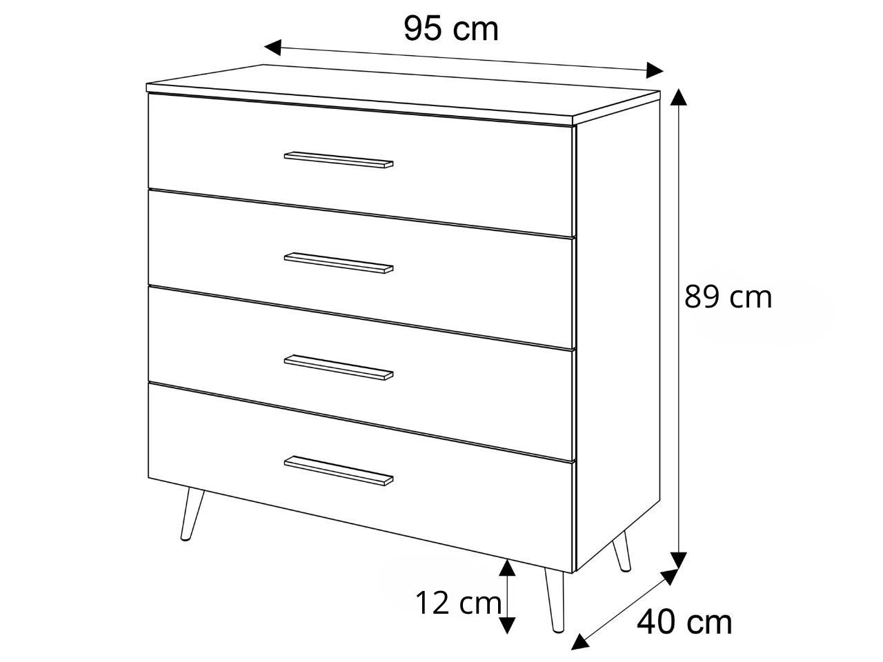 Komoda wyposażona jest w cztery pojemne szuflady, które ułatwiają przechowywanie ubrań, dokumentów, dodatków czy drobiazgów. Szeroki blat świetnie sprawdzi się jako miejsce na dekoracje, rośliny czy rodzinne zdjęcia.