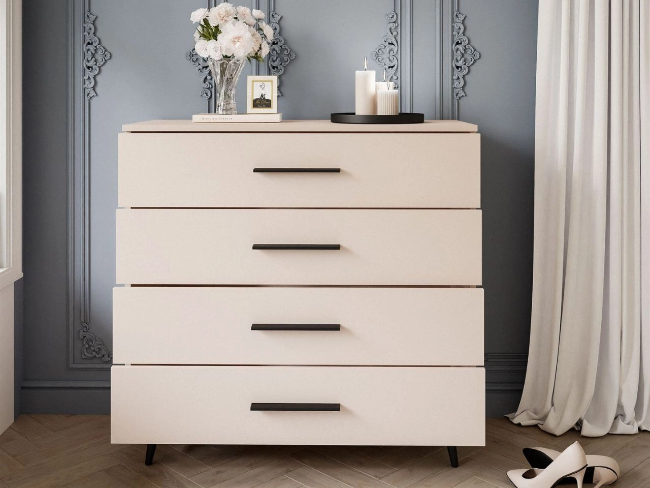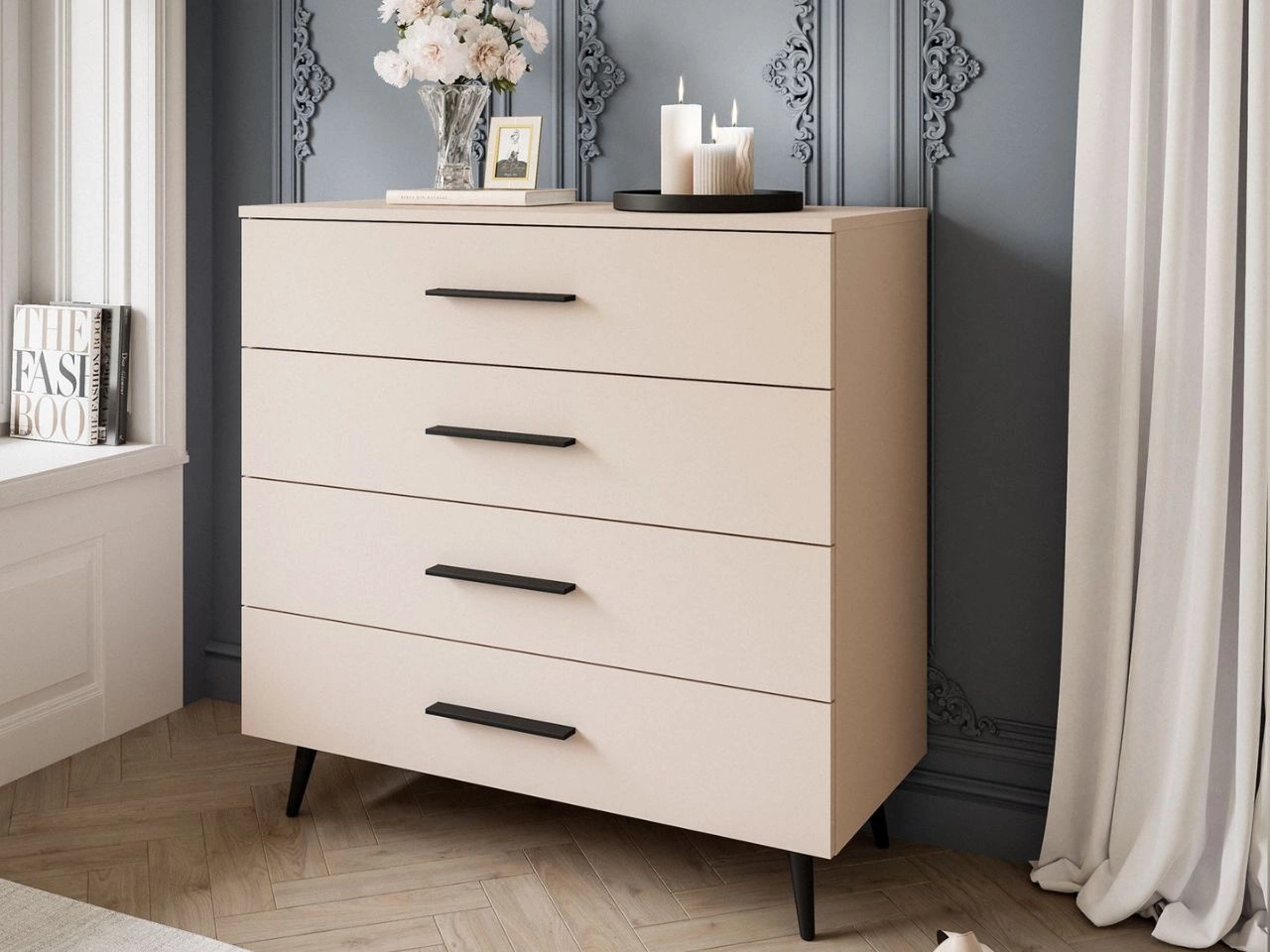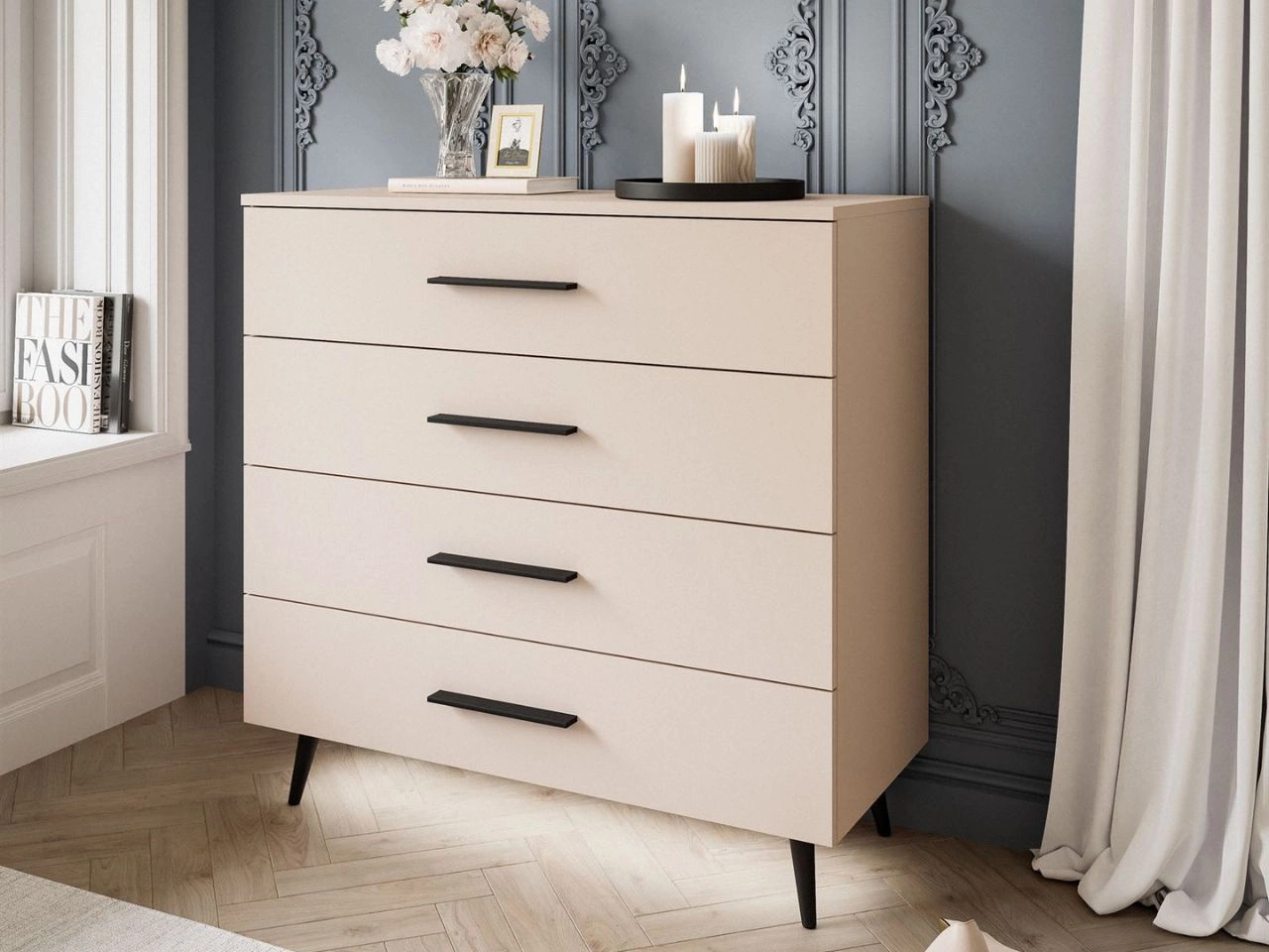 Komoda wyposażona jest w cztery pojemne szuflady, które ułatwiają przechowywanie ubrań, dokumentów, dodatków czy drobiazgów. Szeroki blat świetnie sprawdzi się jako miejsce na dekoracje, rośliny czy rodzinne zdjęcia.