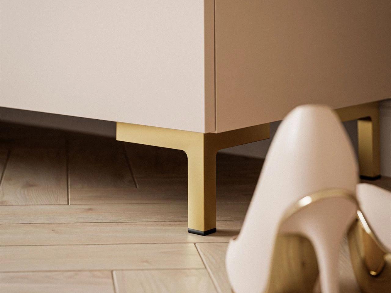Mebel wykonano z wysokiej jakości płyty laminowanej z obrzeżem ABS, dzięki czemu jest trwały, odporny na użytkowanie i łatwy w czyszczeniu. Praktyczne złote uchwyty i nóżki gwarantują komfort użytkowania i stabilność konstrukcji.