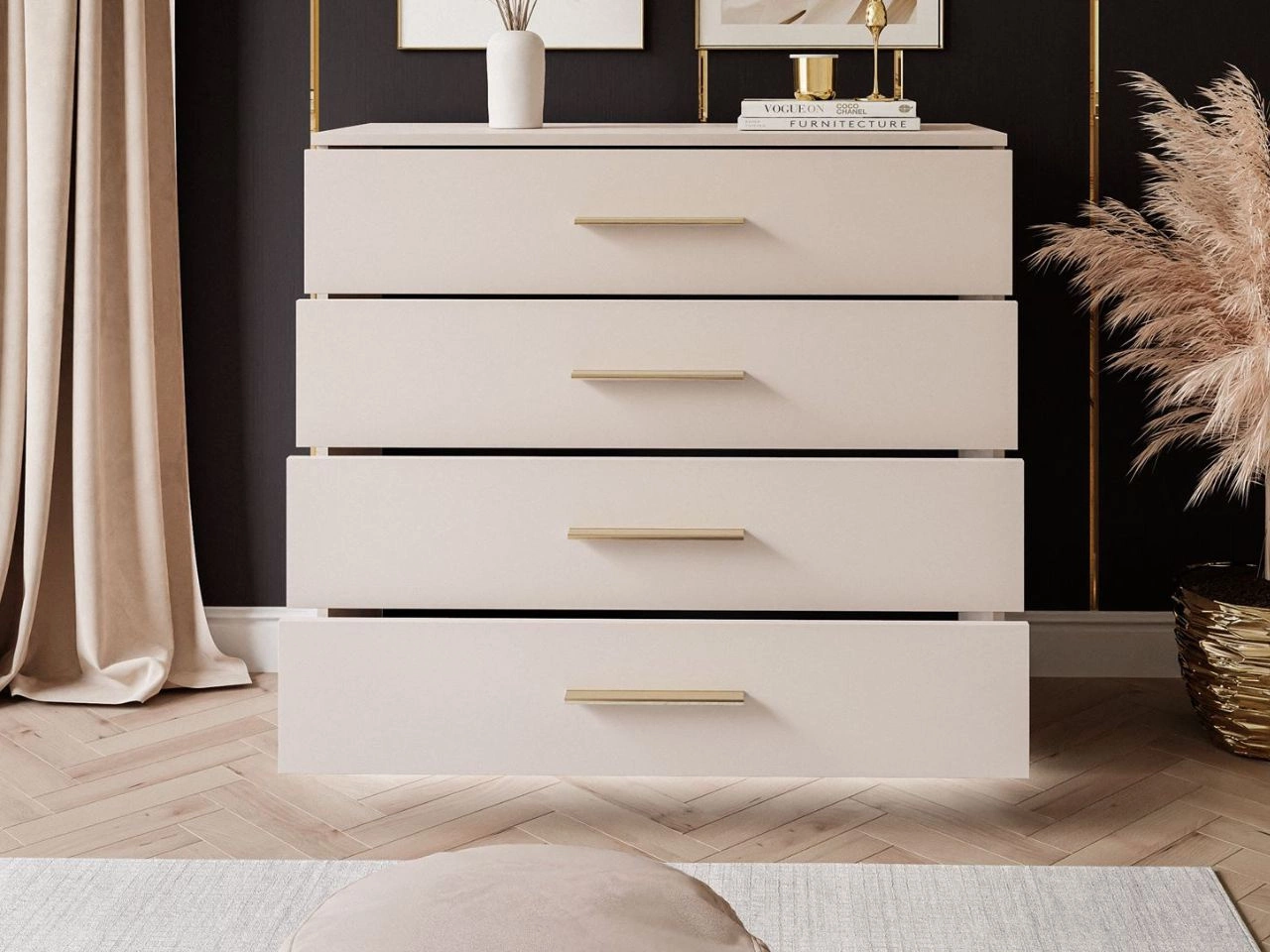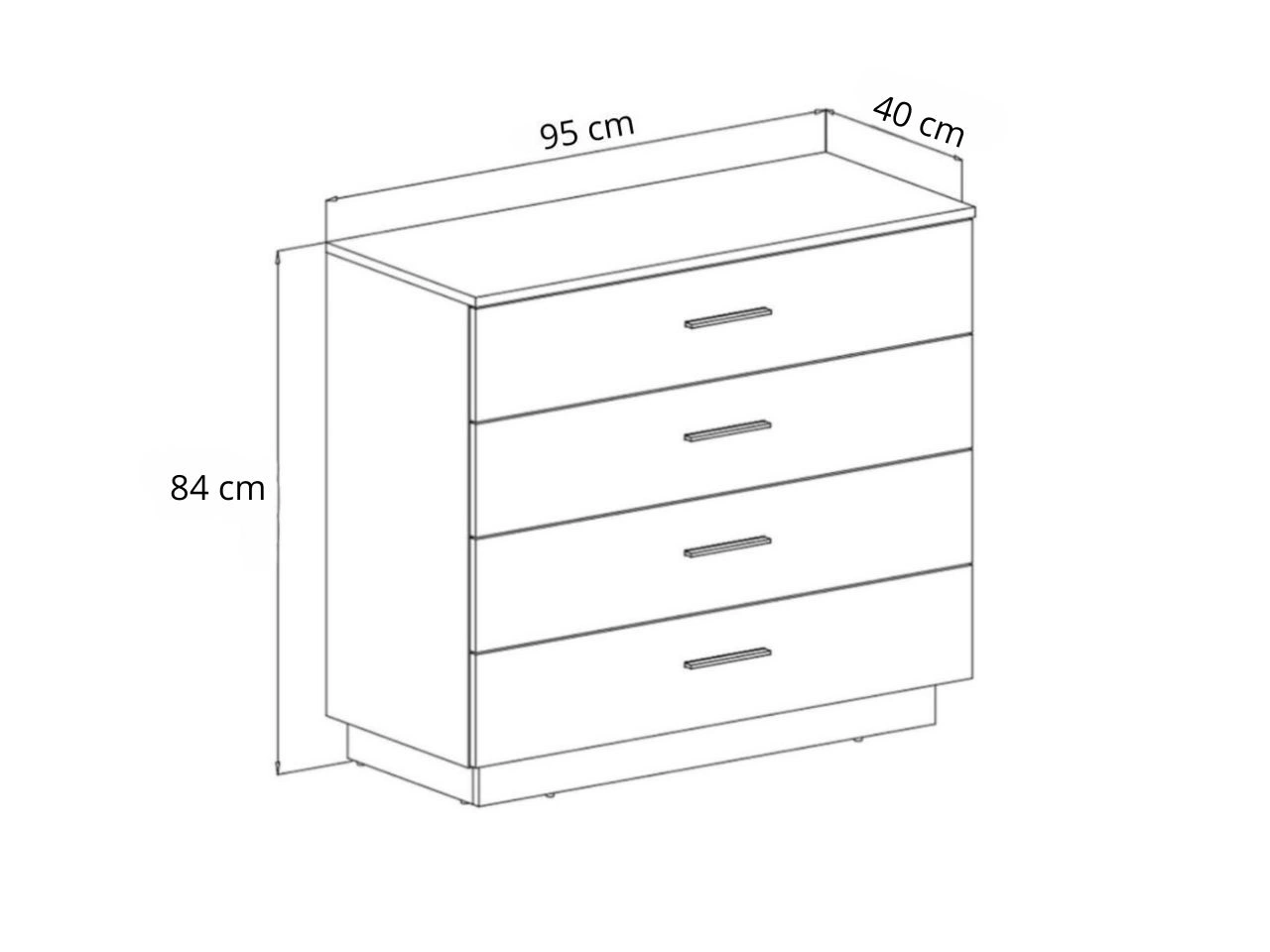 Komoda wyposażona jest w cztery pojemne szuflady, które ułatwiają przechowywanie ubrań, dokumentów, dodatków czy drobiazgów. Szeroki blat świetnie sprawdzi się jako miejsce na dekoracje, rośliny czy rodzinne zdjęcia.