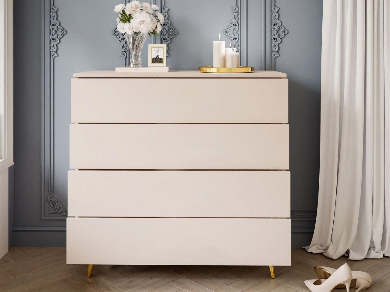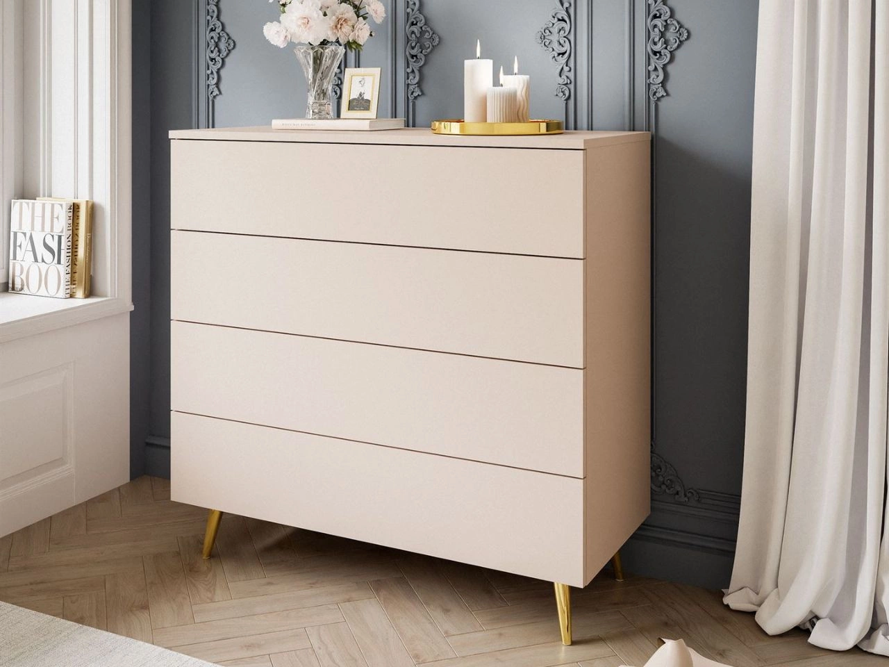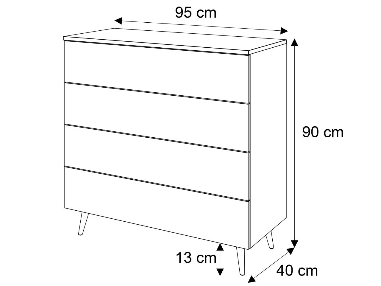 Komoda wyposażona jest w cztery pojemne szuflady, które ułatwiają przechowywanie ubrań, dokumentów, dodatków czy drobiazgów. Szeroki blat świetnie sprawdzi się jako miejsce na dekoracje, rośliny czy rodzinne zdjęcia.