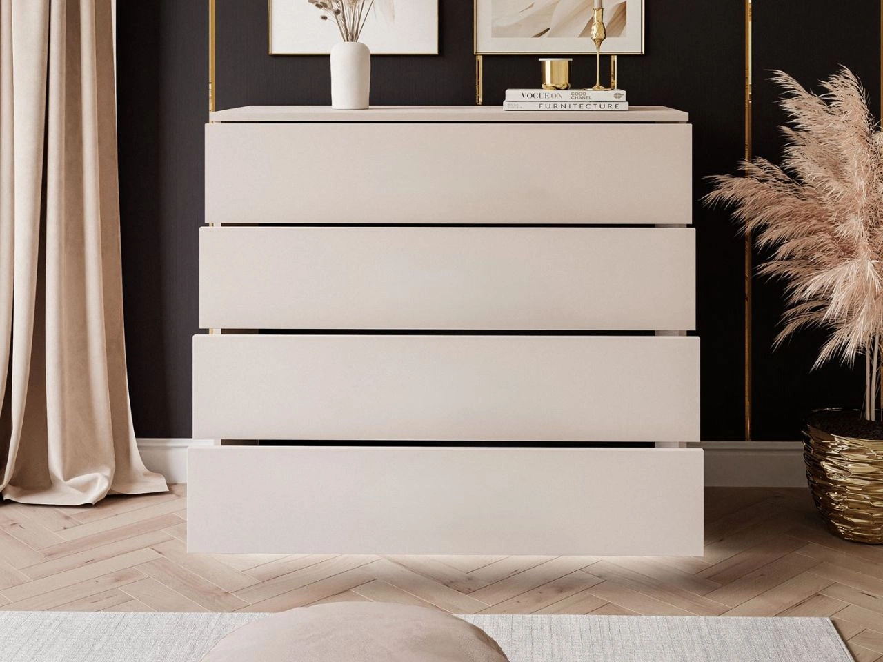 Komoda wyposażona jest w cztery pojemne szuflady, które ułatwiają przechowywanie ubrań, dokumentów, dodatków czy drobiazgów. Szeroki blat świetnie sprawdzi się jako miejsce na dekoracje, rośliny czy rodzinne zdjęcia.