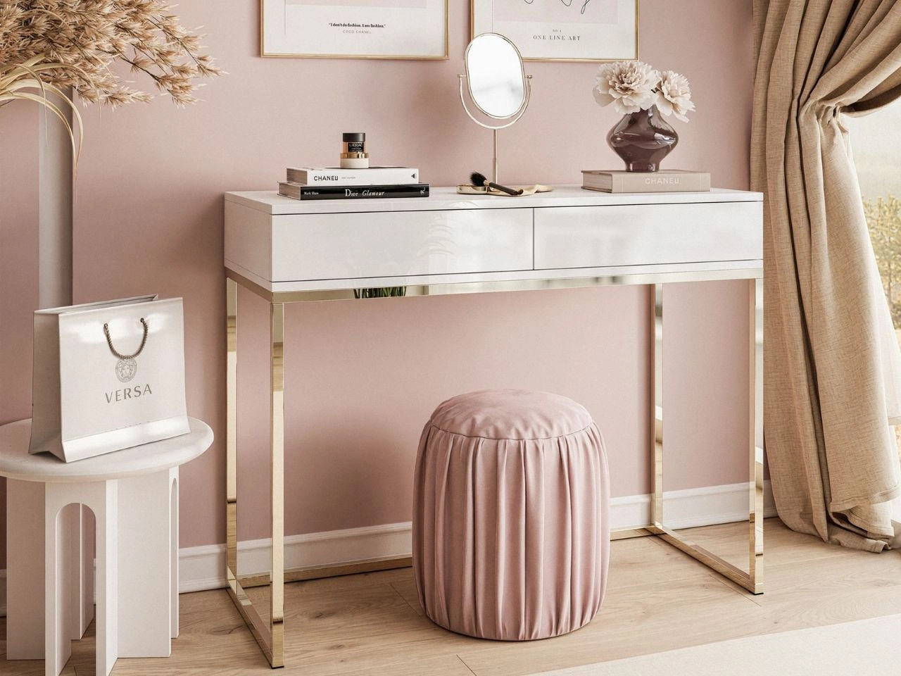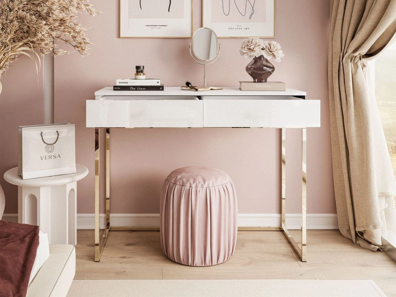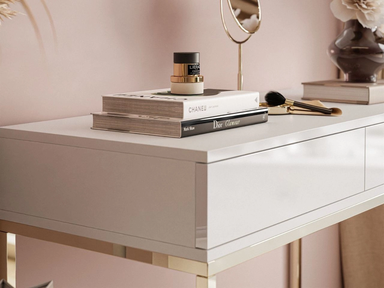 Konsola z szufladami i złotym stelażem w stylu glamour Brisa biały połysk