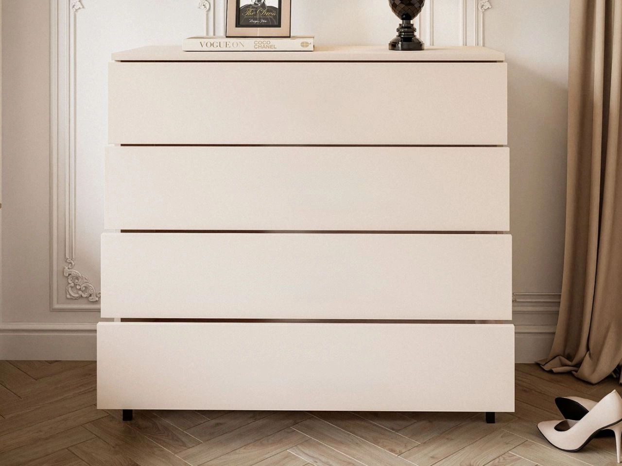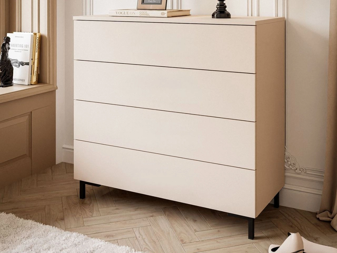 Komoda wyposażona jest w cztery pojemne szuflady, które ułatwiają przechowywanie ubrań, dokumentów, dodatków czy drobiazgów. Szeroki blat świetnie sprawdzi się jako miejsce na dekoracje, rośliny czy rodzinne zdjęcia.