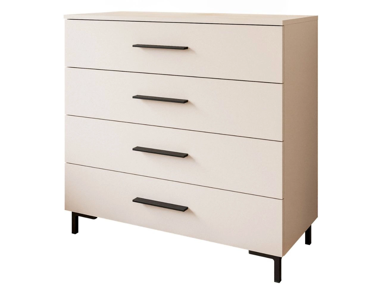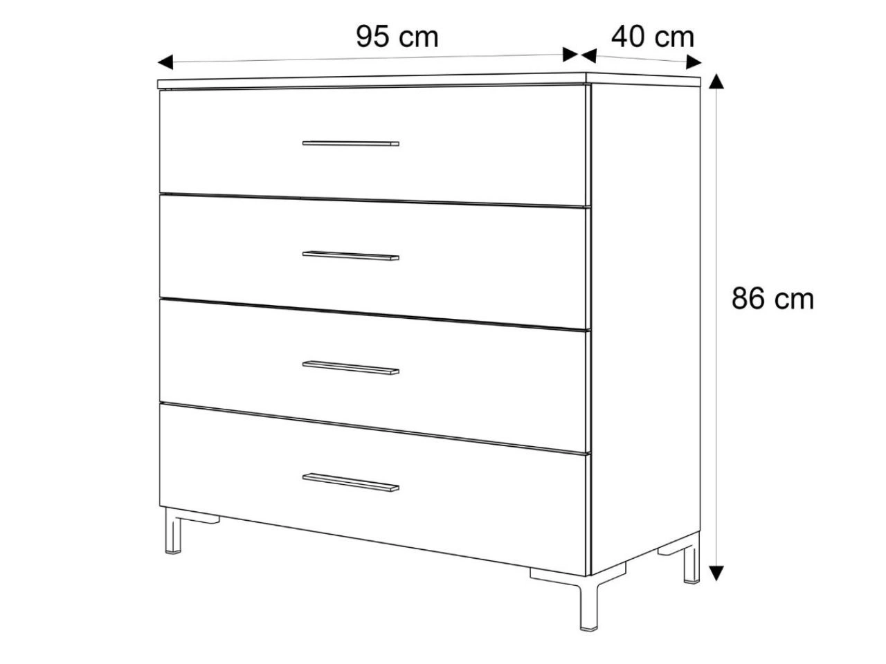 Komoda wyposażona jest w cztery pojemne szuflady, które ułatwiają przechowywanie ubrań, dokumentów, dodatków czy drobiazgów. Szeroki blat świetnie sprawdzi się jako miejsce na dekoracje, rośliny czy rodzinne zdjęcia.