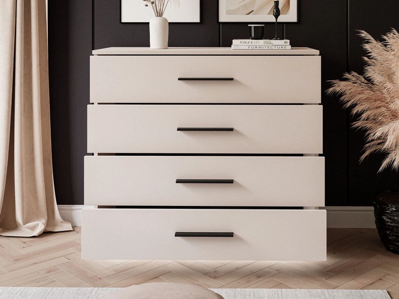 Komoda wyposażona jest w cztery pojemne szuflady, które ułatwiają przechowywanie ubrań, dokumentów, dodatków czy drobiazgów. Szeroki blat świetnie sprawdzi się jako miejsce na dekoracje, rośliny czy rodzinne zdjęcia.