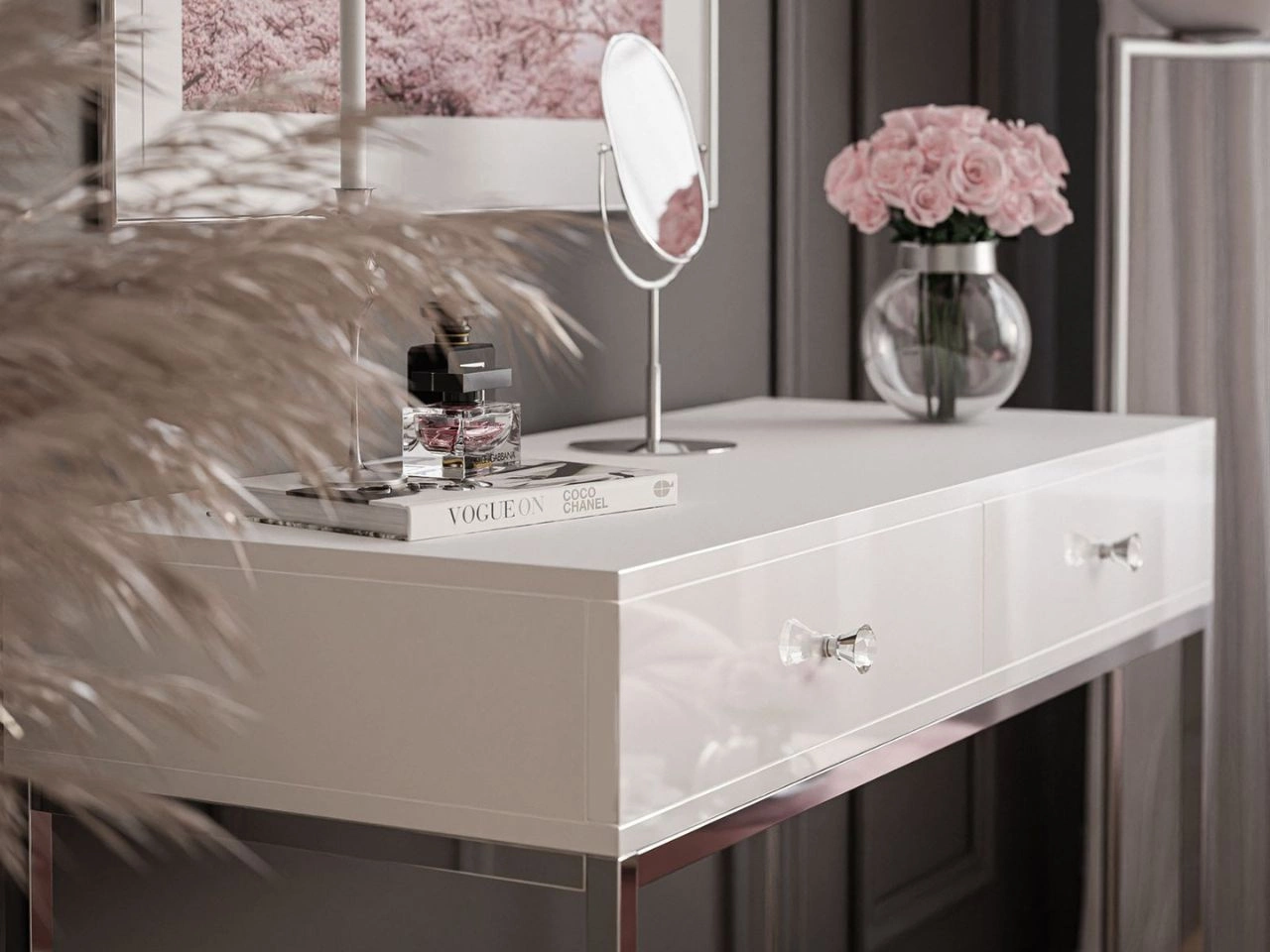 Konsola z szufladami, srebrnym stelażem i kryształowymi uchwytami Brisa biały połysk