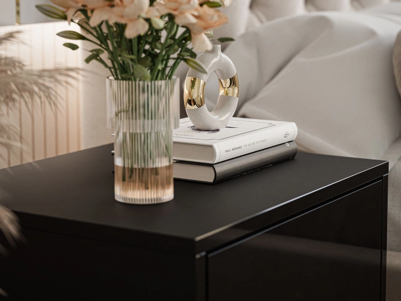 Szafka nocna Brisa na złotym stelażu, to bardzo zgrabny mebel o minimalistycznym charakterze. Jego front wykończony został w czarnym wysokim połysku, w kontraście do korpusu, który pozostał matowy. Front skrywa za sobą praktyczną szufladę, która porusza się na prowadnicach kulkowy, a jej otwieranie odbywa się za pomocą systemu PUSH TO OPEN - naciśnij, aby otworzyć.