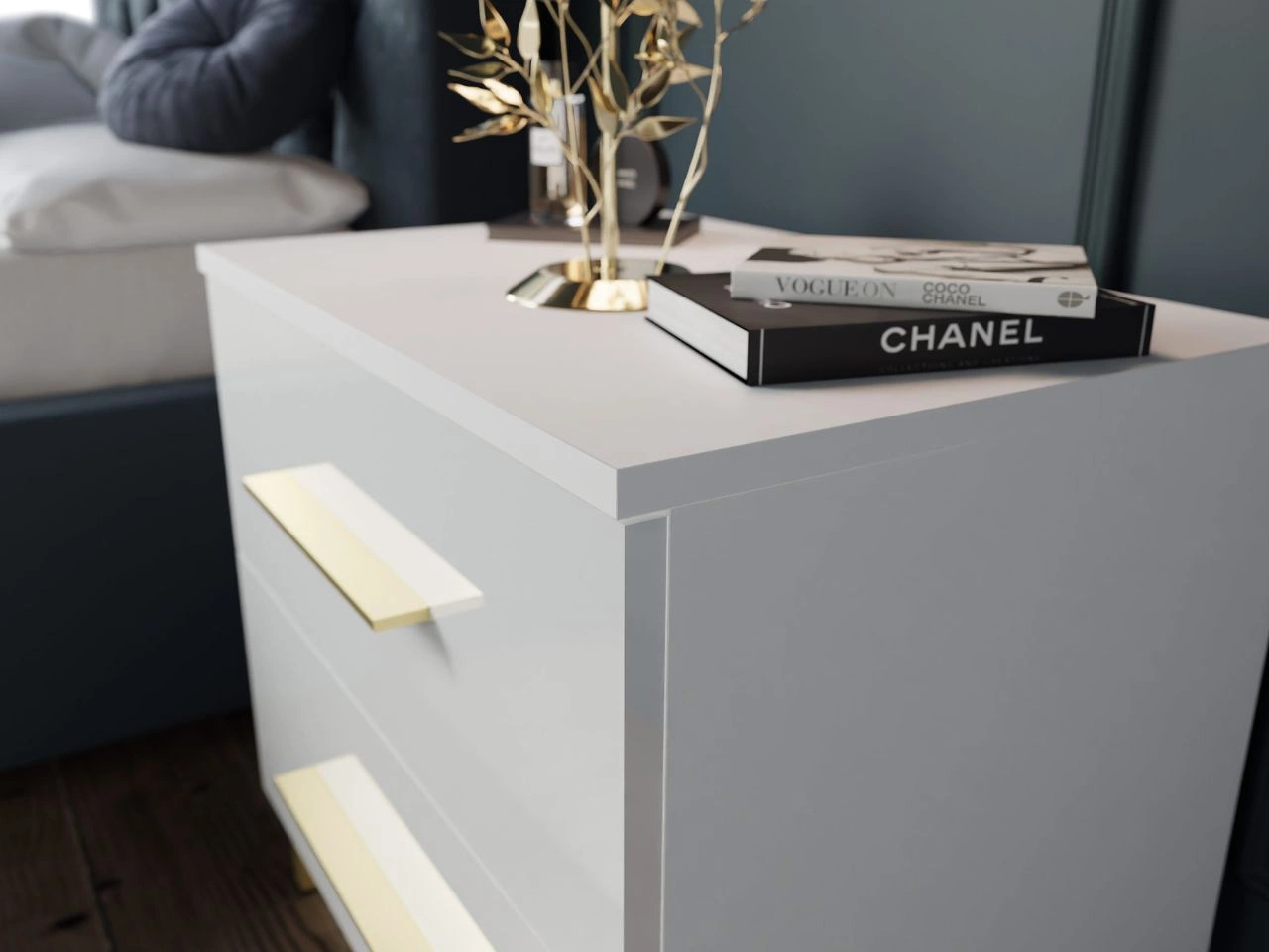 Szafkę nocną wykonano z wytrzymałej płyty laminowanej, a jej fronty powstały z płyty MDF w wysokim połysku, co podkreśla elegancki charakter mebla i zwiększa jej odporność na użytkowanie. Czoła szuflad zabezpieczono obrzeżem ABS, które nadaje im estetyczne wykończenie oraz dodatkowo chroni krawędzie przed uszkodzeniami. Szuflady osadzono na solidnych prowadnicach kulkowych, gwarantujących płynne i komfortowe otwieranie, a całość dopełniają ergonomiczne uchwyty, które zapewniają wygodne korzystanie z szuflad i stanowią subtelny detal dekoracyjny. Konstrukcję podtrzymują nogi, nadające całości lekkości i ułatwiające sprzątanie.