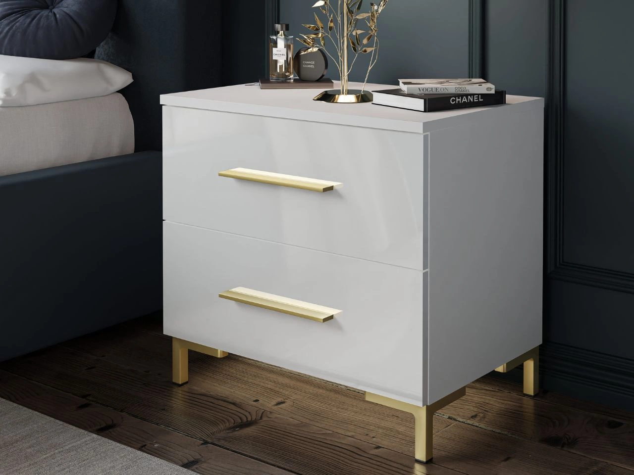 Dobierasz do: Stolik nocny z szufladami na złotych nogach Nuveo Biały połysk
