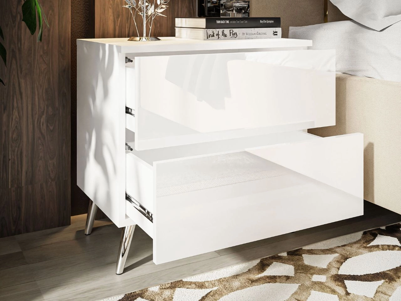 Stolik nocny z szufladami na srebrnych nogach Nuveo Biały połysk