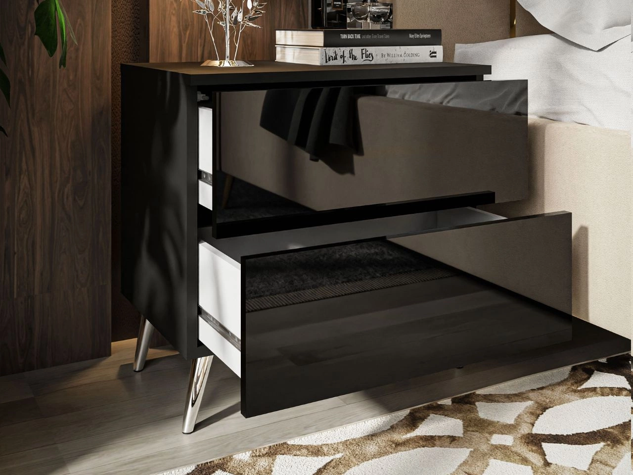 Stolik nocny z szufladami na srebrnych nogach Nuveo Czarny połysk