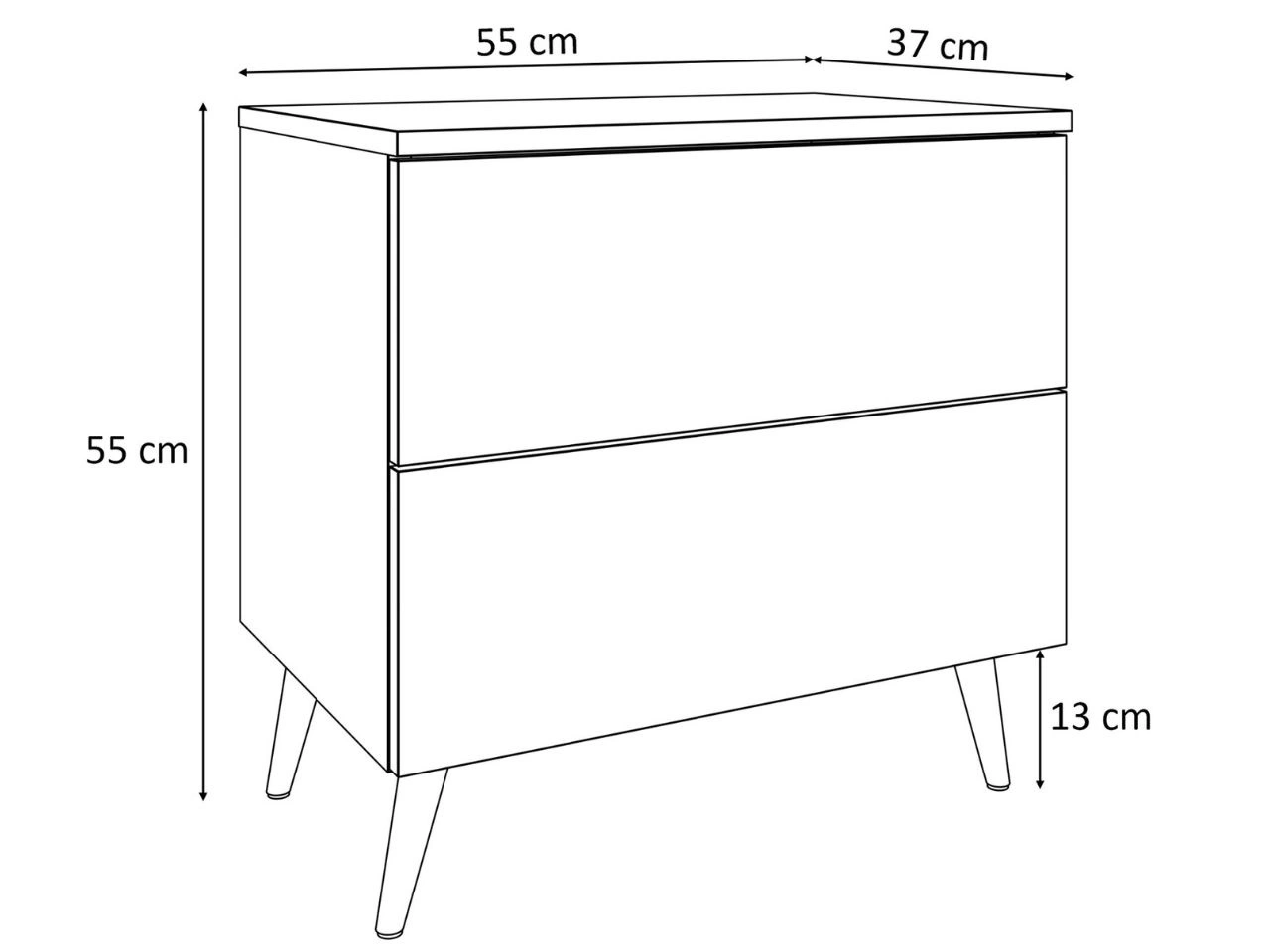 Stolik nocny Nuvego wyposażono w dwie pojemne szuflady, które ułatwiają przechowywanie książek, akcesoriów czy drobiazgów. Obszerny blat świetnie sprawdzi się jako miejsce na lampkę nocną, budzik czy dekoracje, dzięki czemu mebel jest zarówno praktyczny, jak i estetyczny.