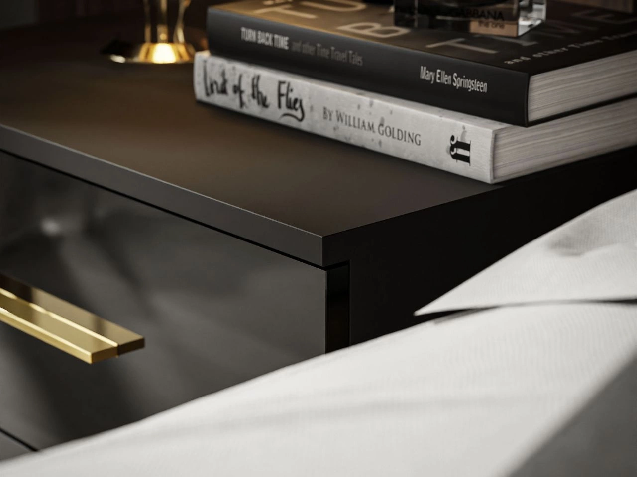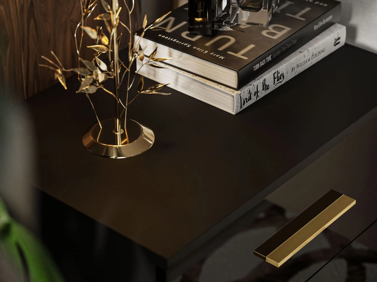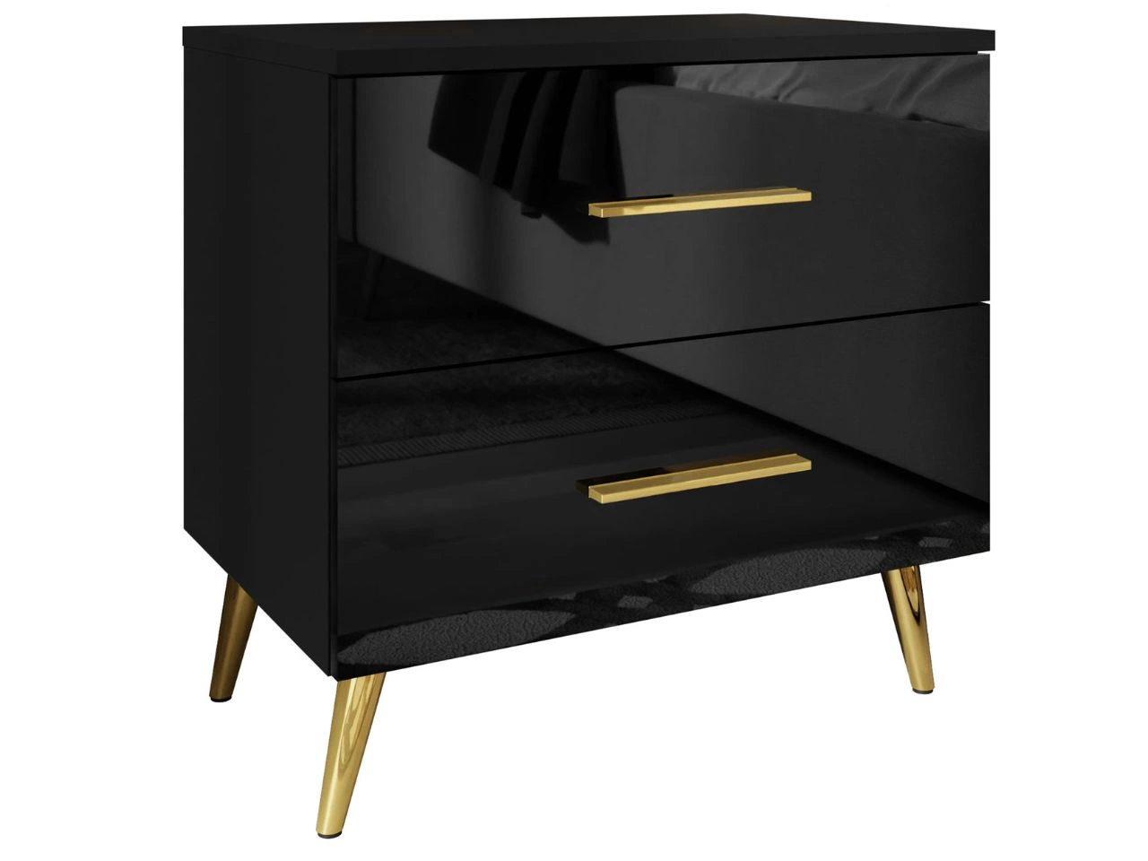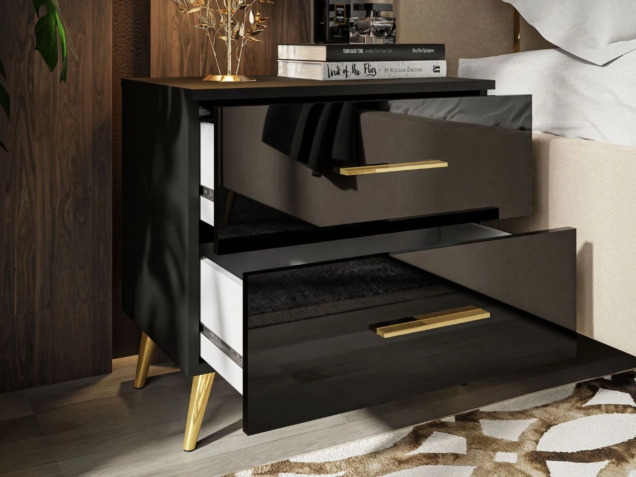 Stolik nocny z szufladami na złotych nogach Nuveo Czarny połysk