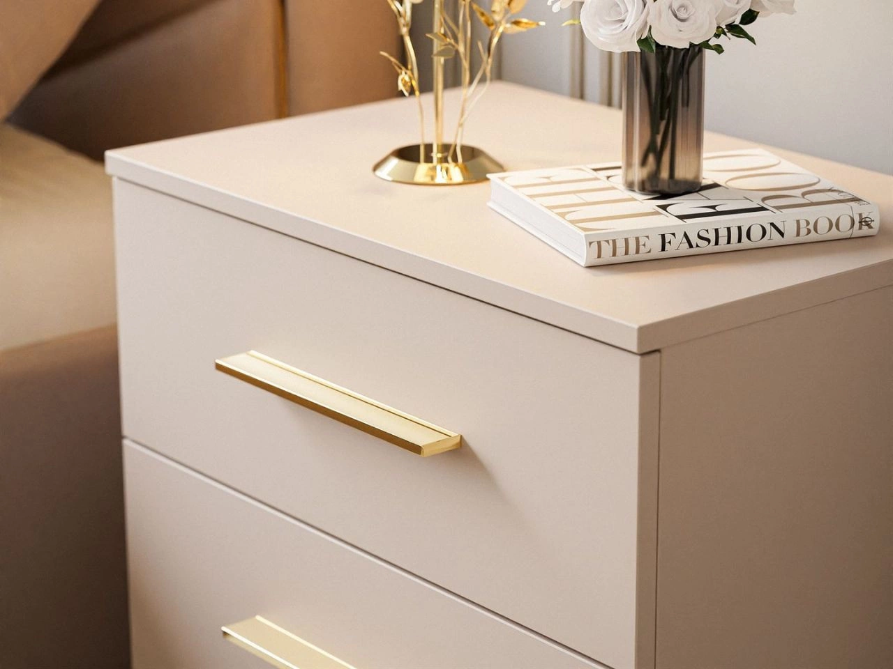 Szafkę nocną wykonano z wytrzymałej matowej płyty laminowanej, co podkreśla elegancki charakter mebla i zwiększa jej odporność na użytkowanie. Czoła szuflad zabezpieczono obrzeżem ABS, które nadaje im estetyczne wykończenie oraz dodatkowo chroni krawędzie przed uszkodzeniami. Szuflady osadzono na solidnych prowadnicach kulkowych, gwarantujących płynne i komfortowe otwieranie, a całość dopełniają ergonomiczne uchwyty, które zapewniają wygodne korzystanie z szuflad i stanowią subtelny detal dekoracyjny. Konstrukcję podtrzymują metalowe nogi, nadające całości lekkości i ułatwiające sprzątanie.