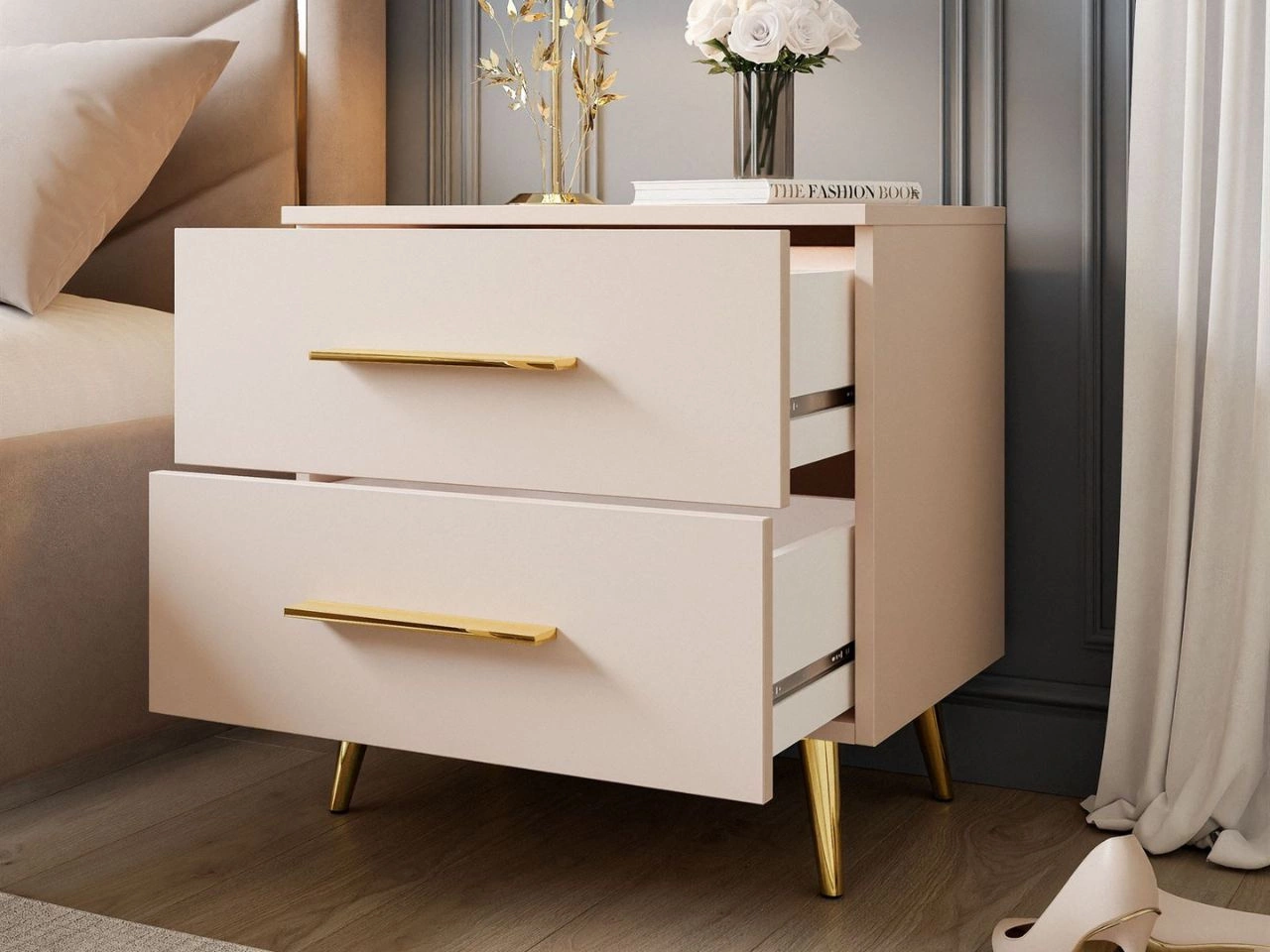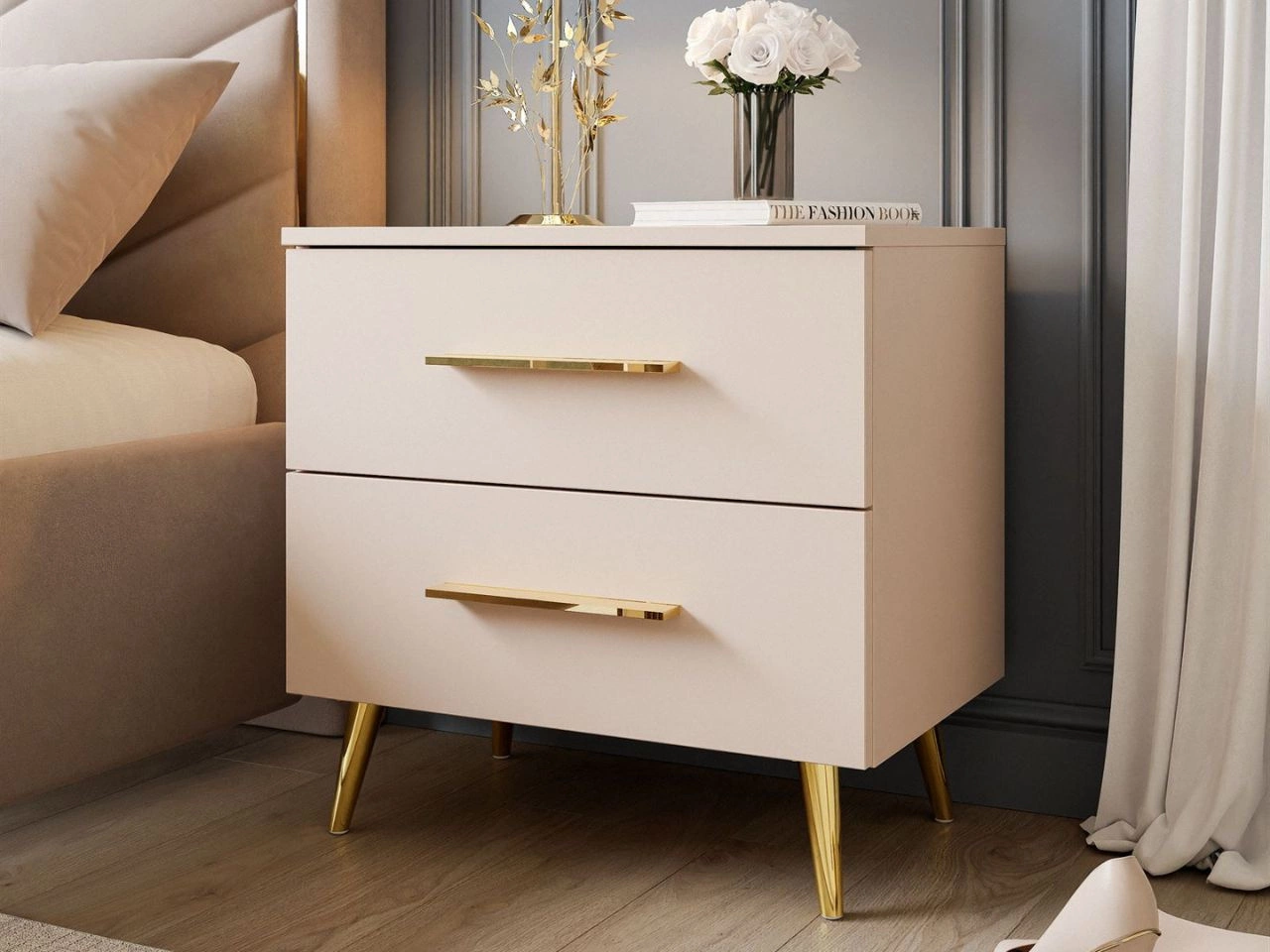 Stolik nocny z dwoma szufladami na złotych nóżkach Nuveo Kaszmir