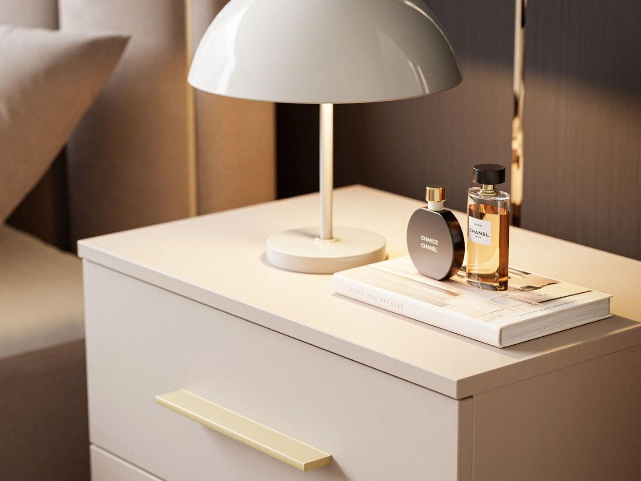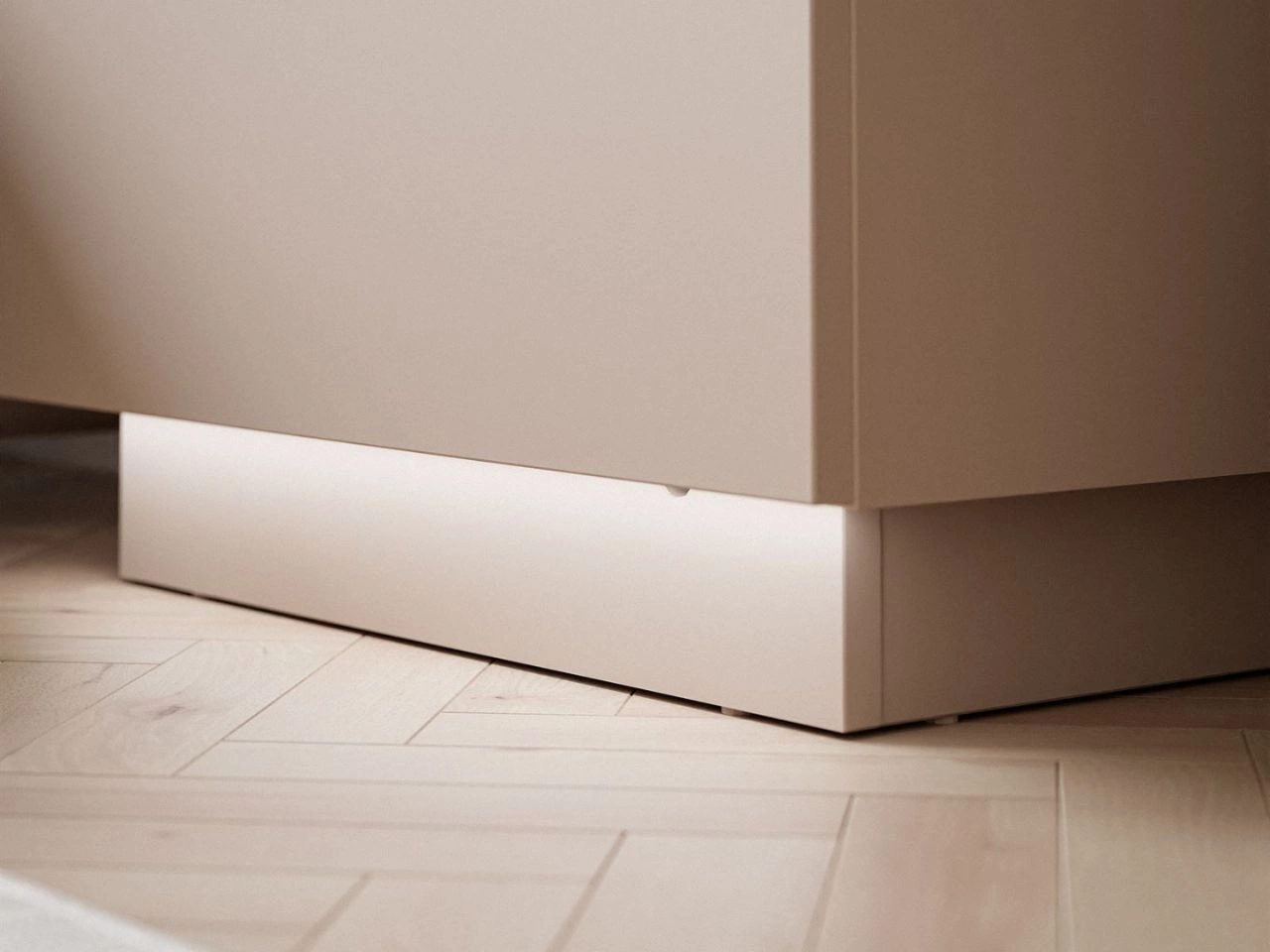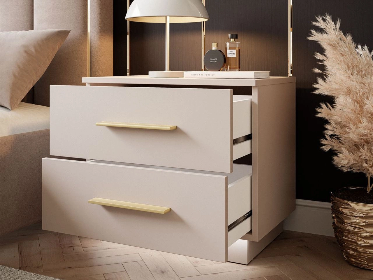 Szafkę nocną wykonano z wytrzymałej matowej płyty laminowanej, co podkreśla elegancki charakter mebla i zwiększa jej odporność na użytkowanie. Czoła szuflad zabezpieczono obrzeżem ABS, które nadaje im estetyczne wykończenie oraz dodatkowo chroni krawędzie przed uszkodzeniami.  Szuflady osadzono na solidnych prowadnicach kulkowych, gwarantujących płynne i komfortowe otwieranie, a całość dopełniają ergonomiczne uchwyty, które zapewniają wygodne korzystanie z szuflad i stanowią subtelny detal dekoracyjny. Cokół cofnięty pod konstrukcją nadaje meblowi wizualnej lekkości oraz ułatwia utrzymanie czystości.