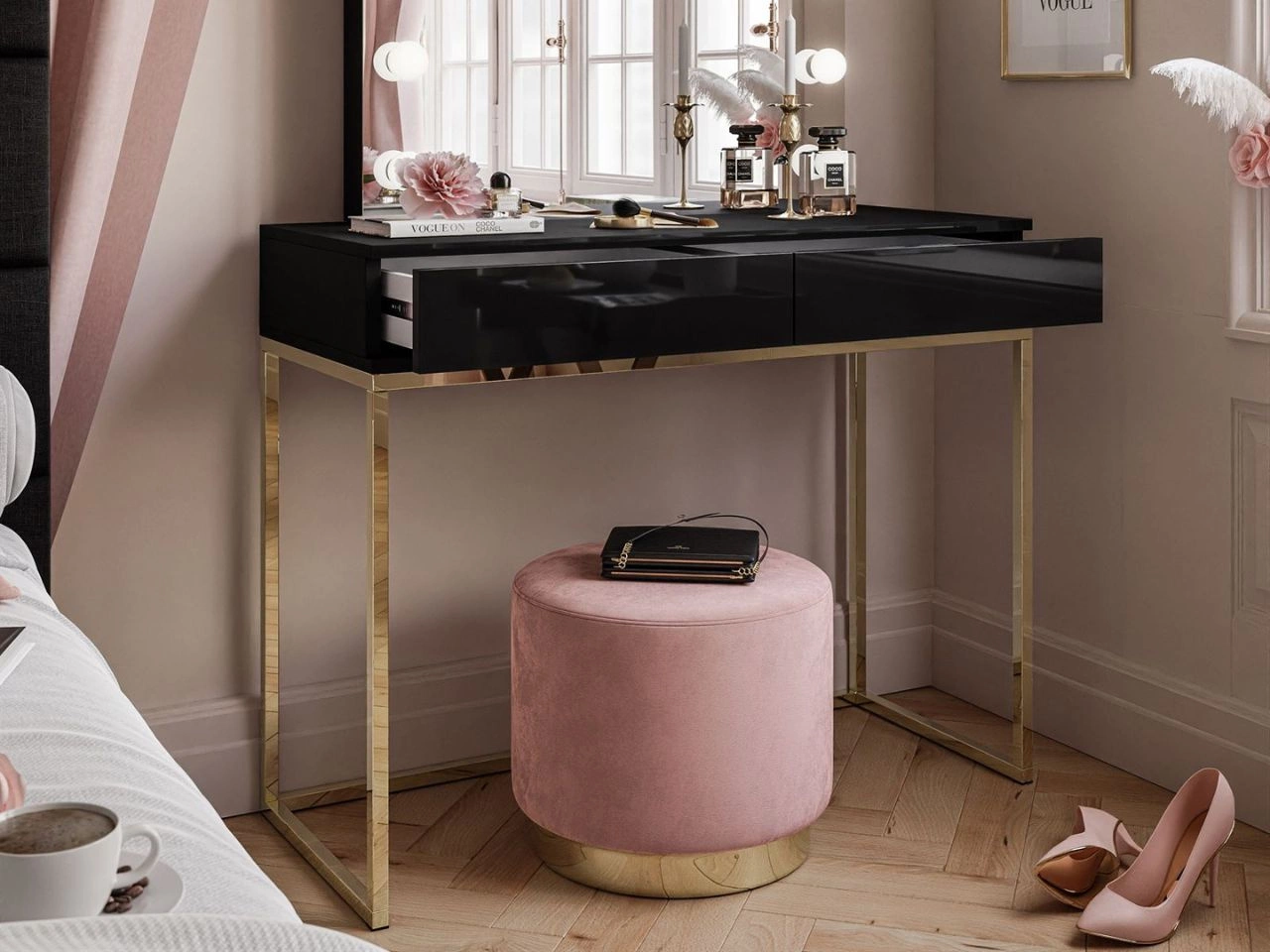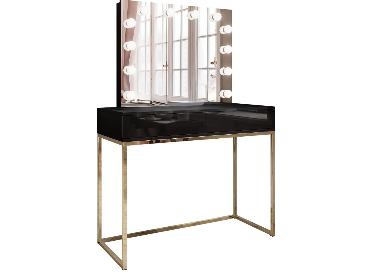 Czarna toaletka z lustrem i oświetleniem LED Brisa to bardzo estetycznie wykonany mebel, który świetnie wpasuje się w najróżniejsze aranżacje. Korpus mebla i ramę lustra wykonano z matowej płyty laminowanej. Fronty natomiast wykończono w wysokim połysku. Całość ustawiona jest na złotym metalowym stelażu, który nie tylko dobrze wygląda, ale również zapewnia odpowiednią stabilność konstrukcji.